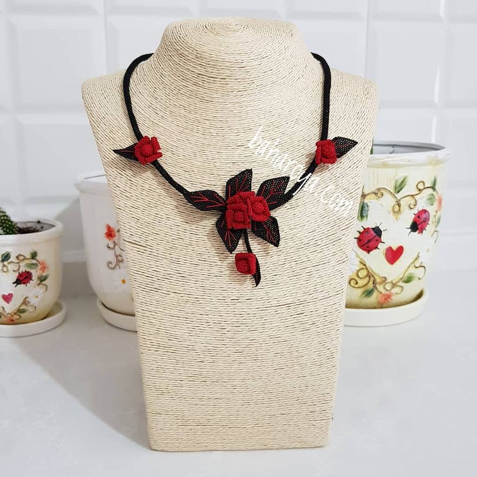 İğne Oyası Goncagül Borulu Kolye Siyah Saplı Moda Kolayları
