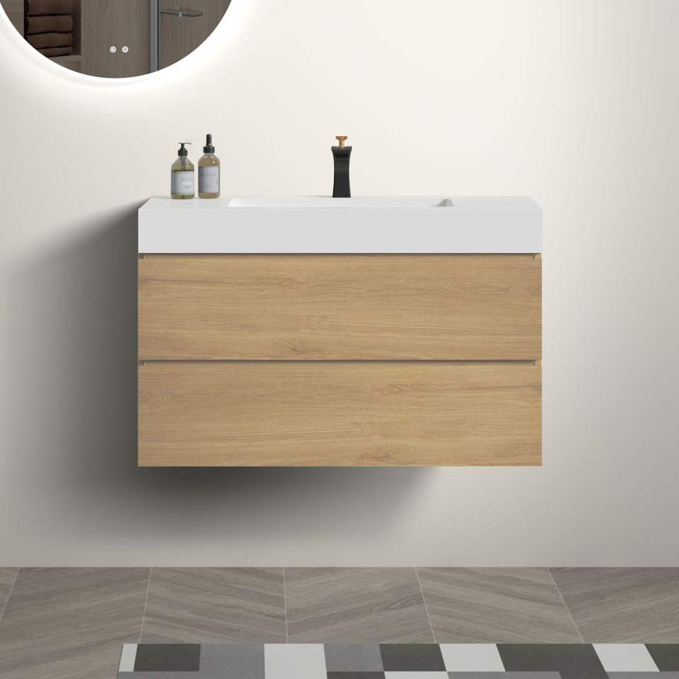 36 \ "lavabo da bagno in rovere grande contenitore a parete galleggiante Design moderno pezzo unico scarico lavabo nero Pre-assemblato
