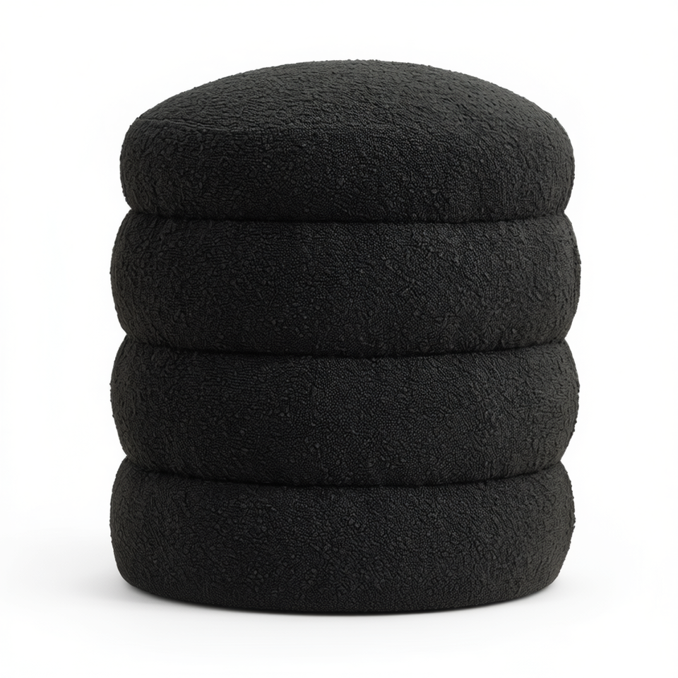 Pouf Rotondo in Morbido Tessuto Bouclé Nero, Sgabello Contemporaneo per Arredamento Soggiorno