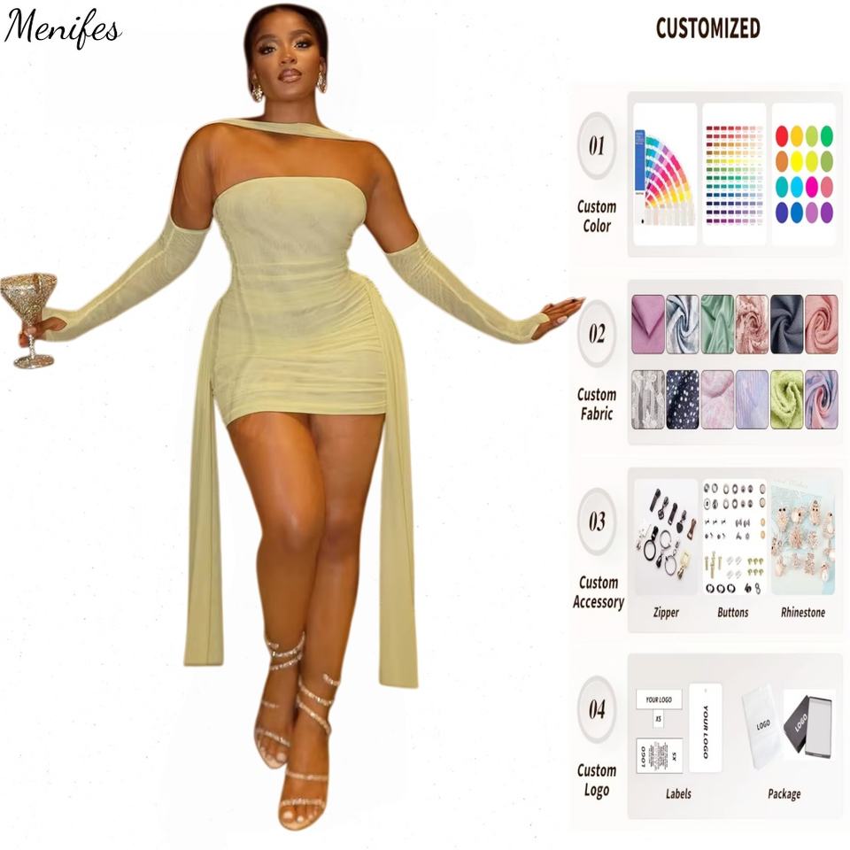 0Beige Dress One Shoulder Long Sleeve Sheer Gloves Fitted Bodice Mini Sexy Night Out Women's Dress