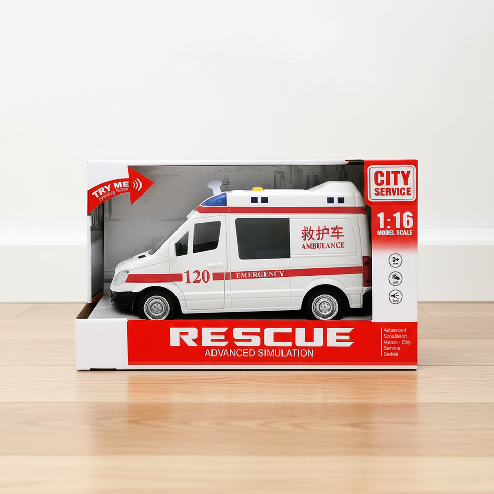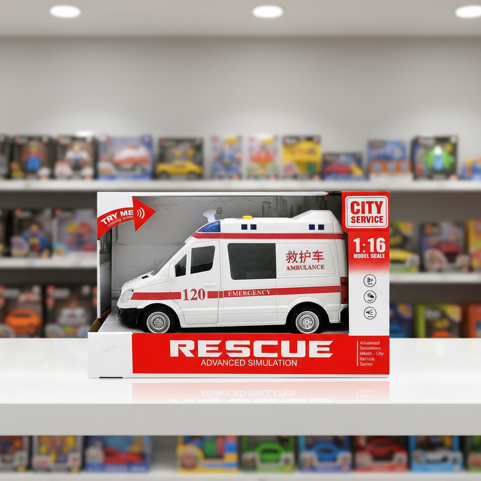 DESCRIZIONE:Ambulanza giocattolo a frizione 1:16 con luci e musica