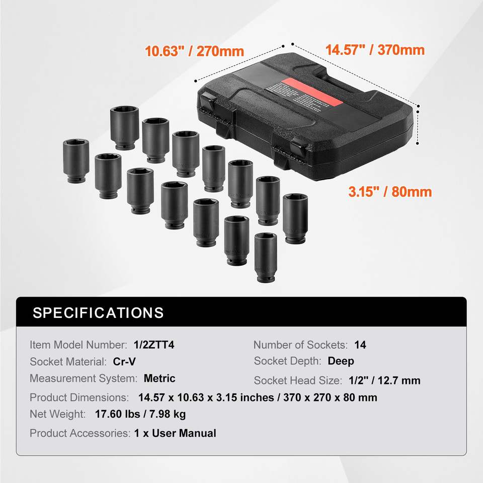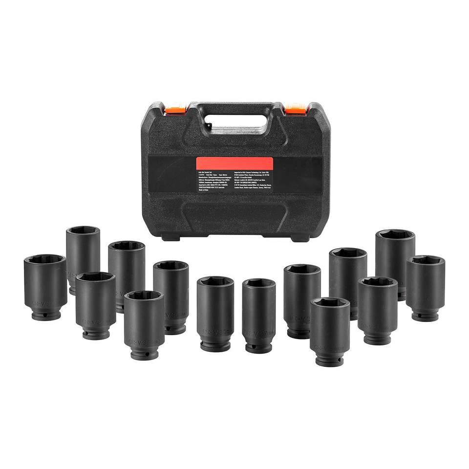 Set di chiavi a bussola a impatto da 1/2 pollice per dadi dell'asse, 14 pezzi, metrici grandi, per dadi del cardano, trattamento termico CR-V, a 6+12 punte, profonde
