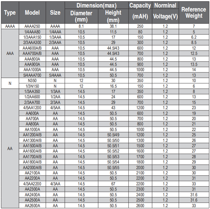 1.2V 350Mah Nimh batteria ricaricabile Ni Mh AA batteria