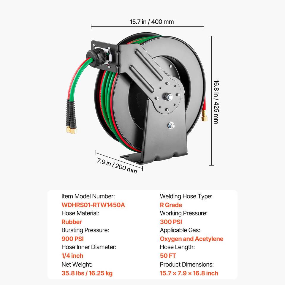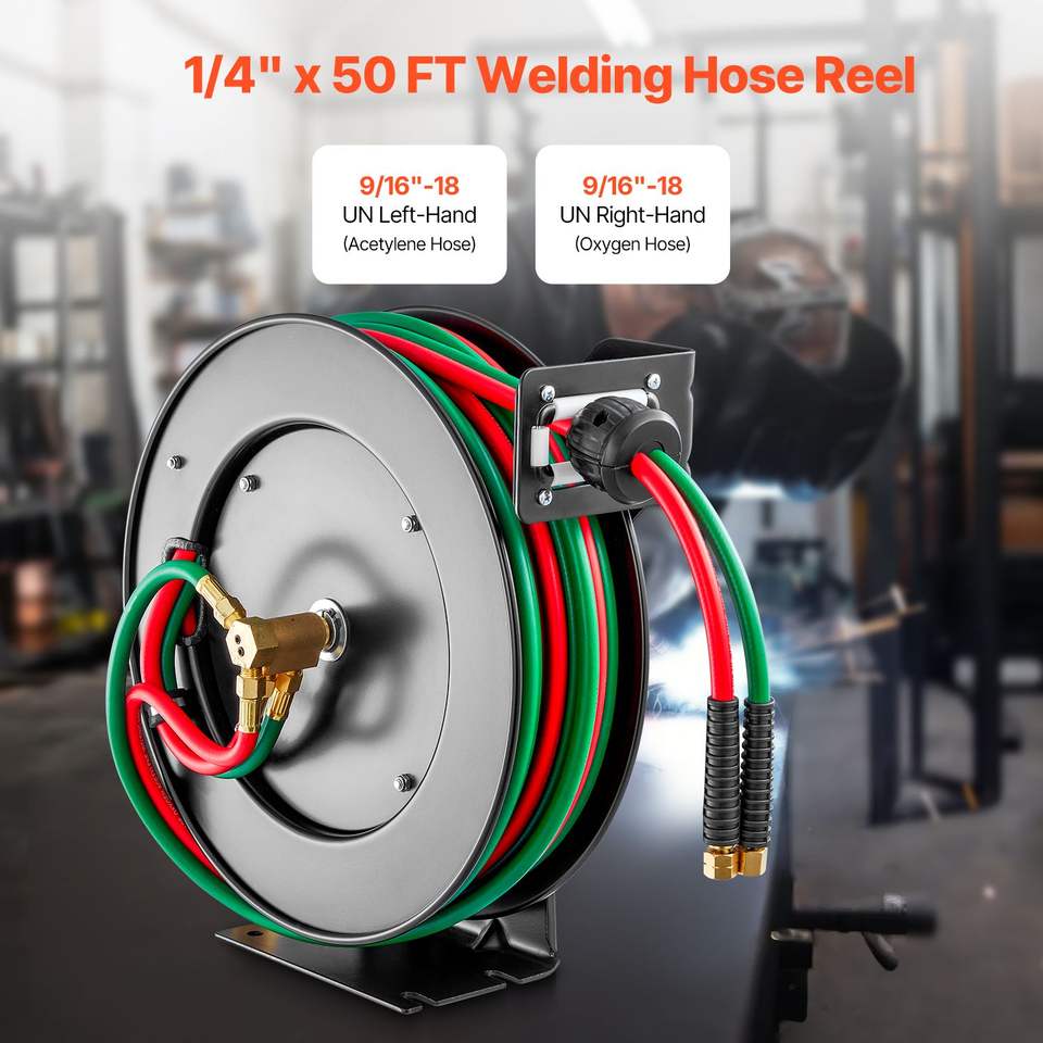 Avvolgitubo Retrattile per Saldatura Ossigeno-Acetilene 1/4 di Pollice x 50 Piedi, Grado R Doppio, per Montaggio a Soffitto/Parete, Resistente, 300 PSI, in Gomma