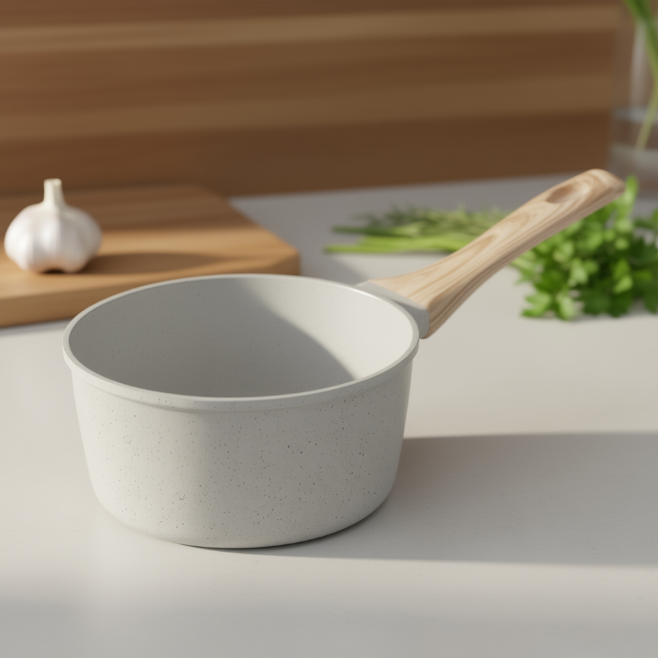 Nonstick Saucepan 1.5 Qt White Ceramic Coating Induction Compatible Detachable Wood Handle Minimalist Design