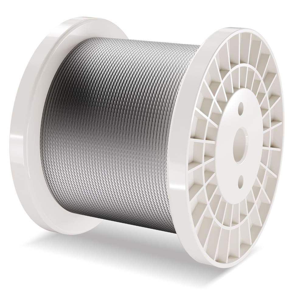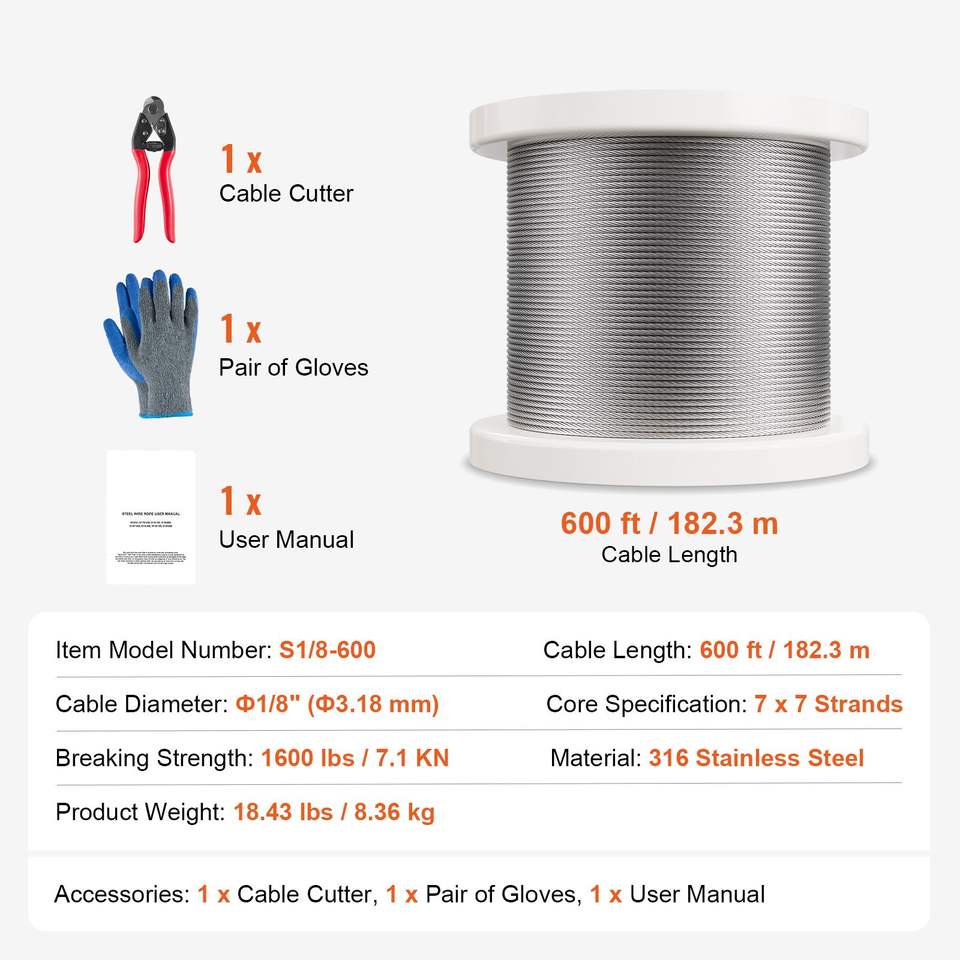 Kit Cavo in Acciaio Inox 316 da 1/8'' 600 Piedi con Tagliacavi e Guanti, Resistenza alla Rottura 1600 Libbre, 7x7 Fili, Corde per Costruzioni