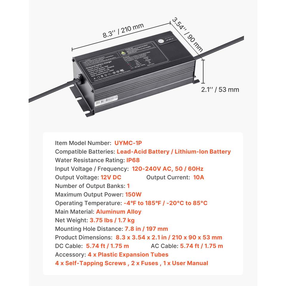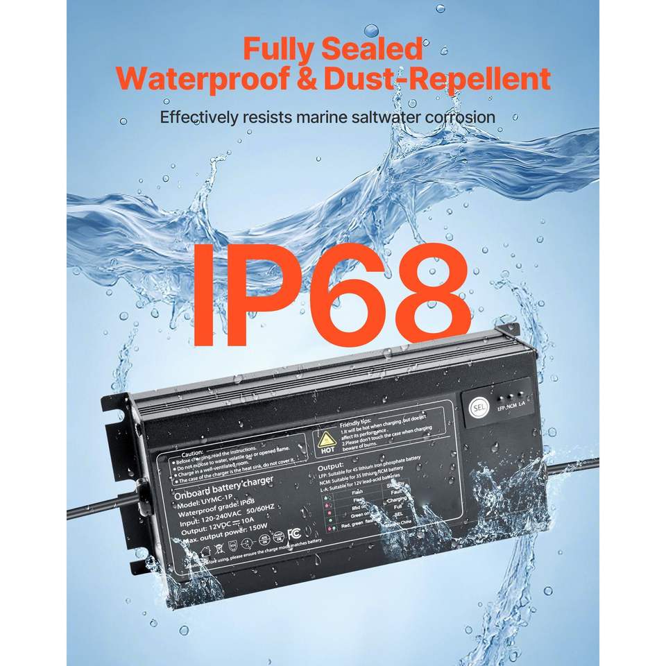 Caricabatterie Marino Intelligente 1-Banca 10A 12V Impermeabile IP68 per Batterie al Litio-Ion per Barche