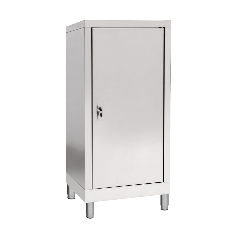Low, single-door stainless steel storage cabinet | MayermooverSEO Title