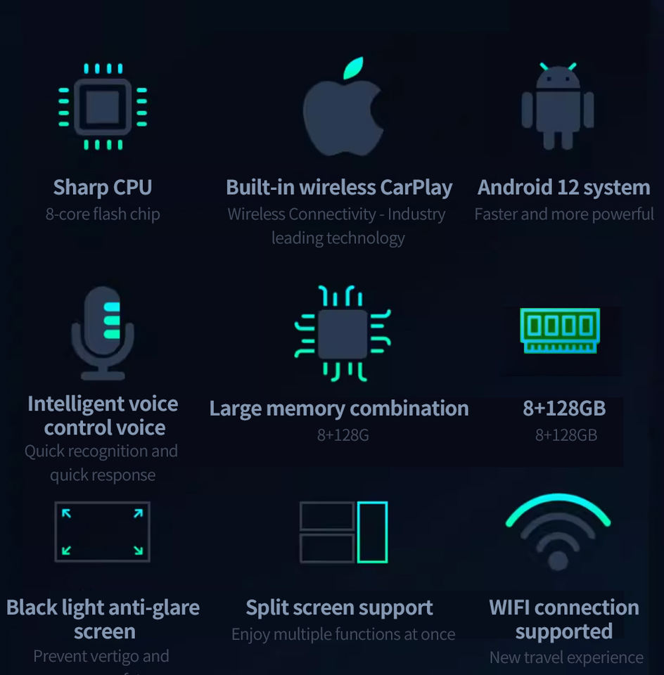 SDK, GPS, Stereo Stereo, DSP, CarPlay, Specchio Link, Android auto, Microfono incorporato, Schermo diviso, Auto Controllo del Volante, Altoparlante integratoFunzione