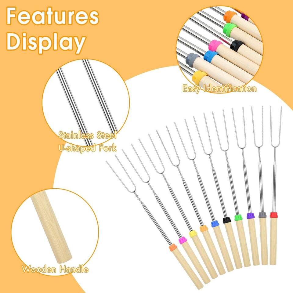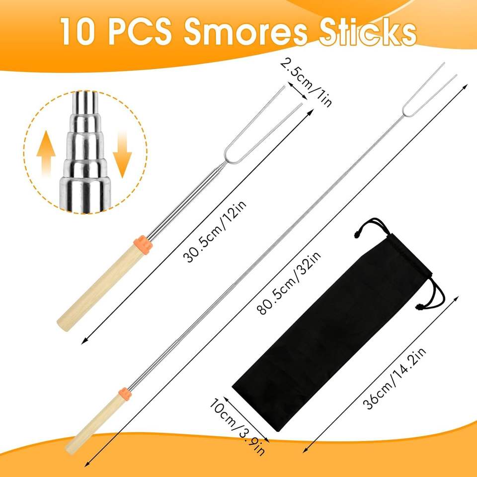 Set di 10 Spiedini Estensibili da 32 Pollici per Arrostire, Forchette per Hot Dog, Bastoncini per S'mores, Accessori per Falò e Campeggio