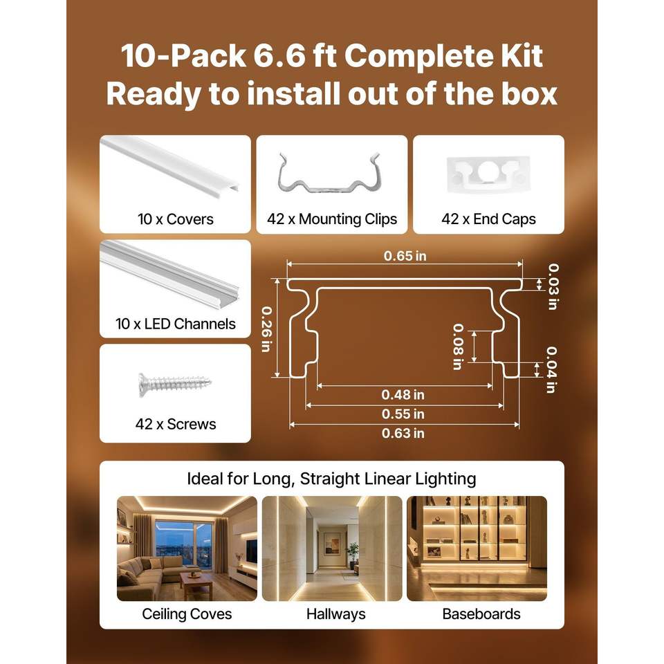 Confezione da 10 Profili LED in Alluminio a Forma di U da 2M/6,6 Ft con Copertura Opaca, Tappi Terminali e Clip di Montaggio