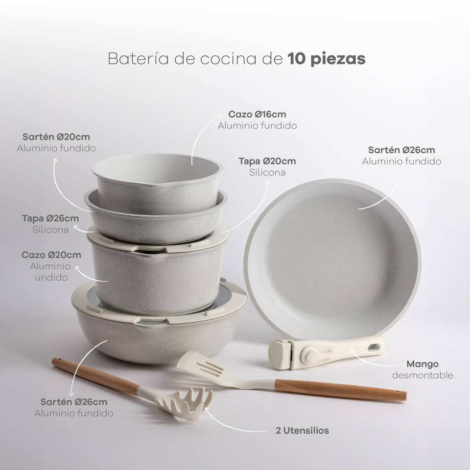 Set di pentole beige da 10 pezzi con manici rimovibili, 3 padelle, 2 casseruole, coperchi e utensili + set di utensili da cucina da 3 pezzi