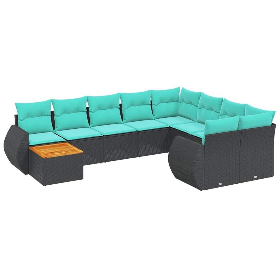 Set di divani da giardino in polyrattan nero da 10 pezzi con cuscini, mobili da esterno dal design contemporaneo