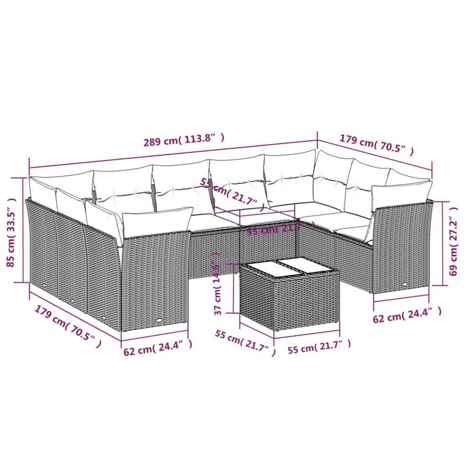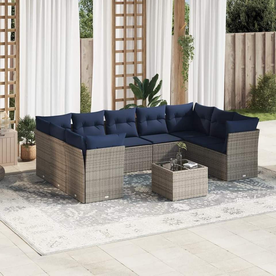 Set di divani da giardino in polyrattan grigio da 10 pezzi con cuscini, collezione di mobili da esterno resistenti