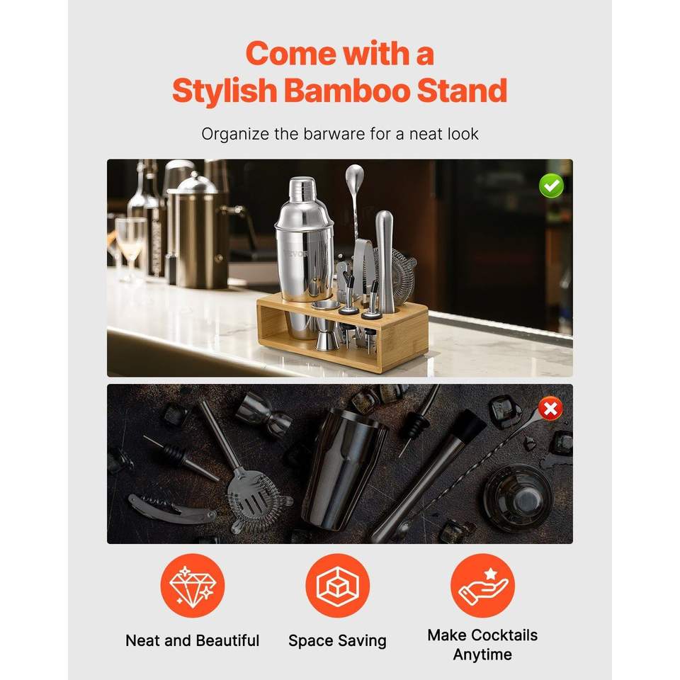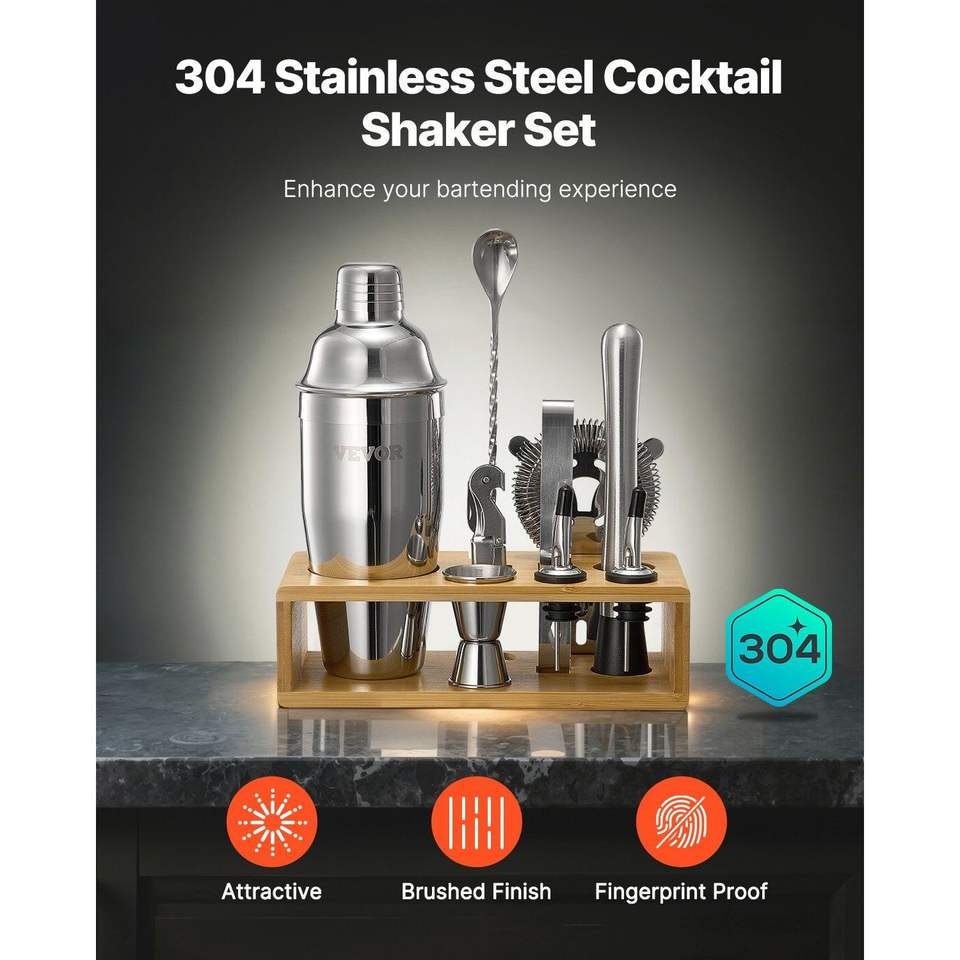 Set da 10 Pezzi per Cocktail in Acciaio Inox, Kit da Barman con Supporto in Bambù, Mixer, Cucchiaio, Miscelatore per Martini