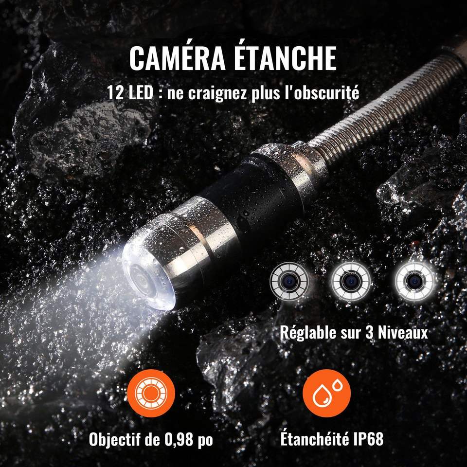 Endoscopio Industriale Impermeabile IP68 da 30 m/100 ft con Schermo da 7 Pollici, Telecamera per Ispezione Fognature e Tubazioni con Funzione DVR, 12 LED Regolabili