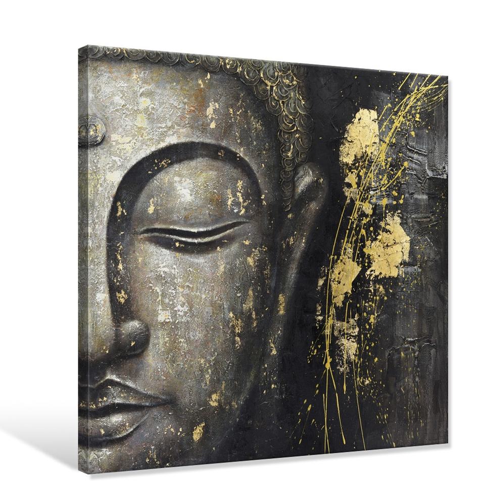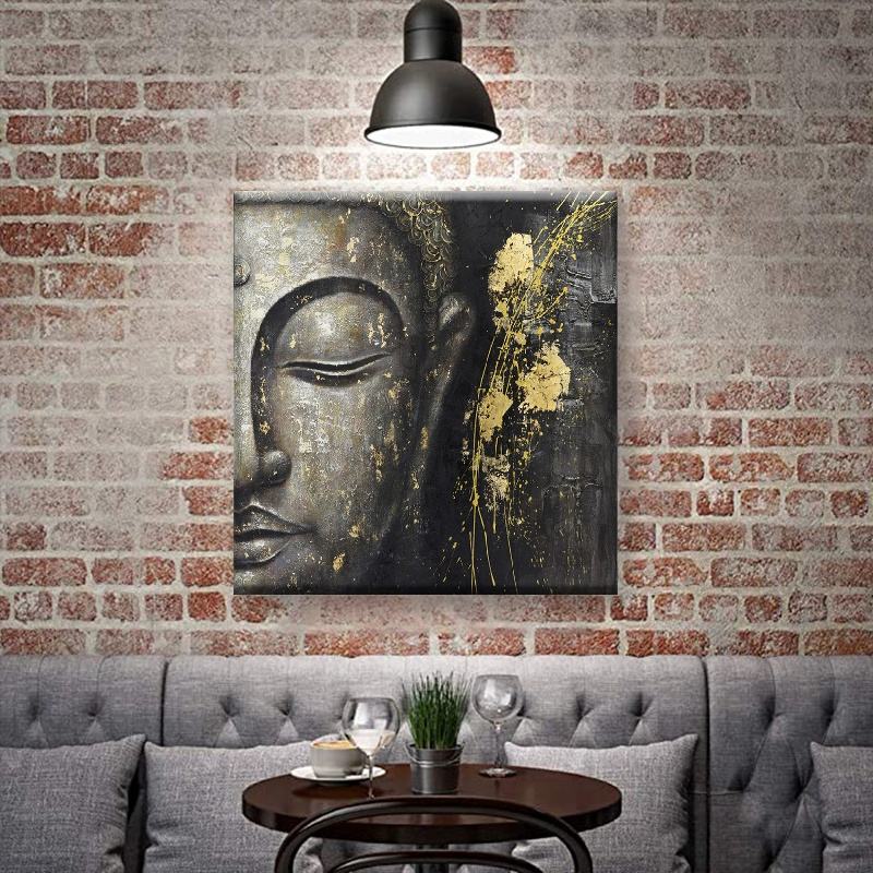 Dipinto a Olio Moderno 100% Fatto a Mano di Buddha Mezzo Volto Giallo Dorato su Tela, Pittura Astratta di Buddha per Decorazione Murale del Soggiorno