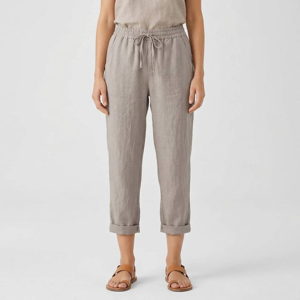 100% Linen Breathable Canvas Casual Summer High-Waisted Balloon Cut Wide Midi Pants with Drawstring