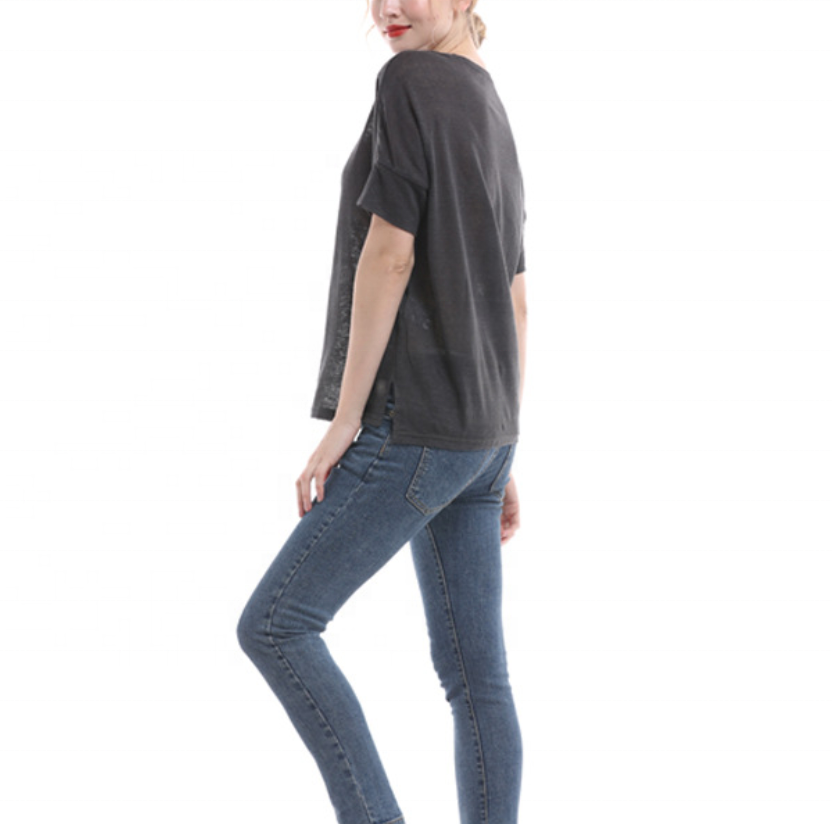 100% Linen Women`s Black T Shirts Wholesale Plain Color Summer Short Sleeve Linen Clothing Women
