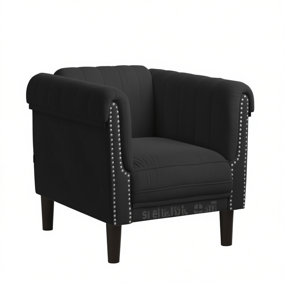 Poltrona in Velluto Nero 100% Poliestere con Gambe in Legno Massello e Schienale Trapuntato per Soggiorno