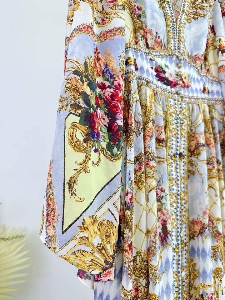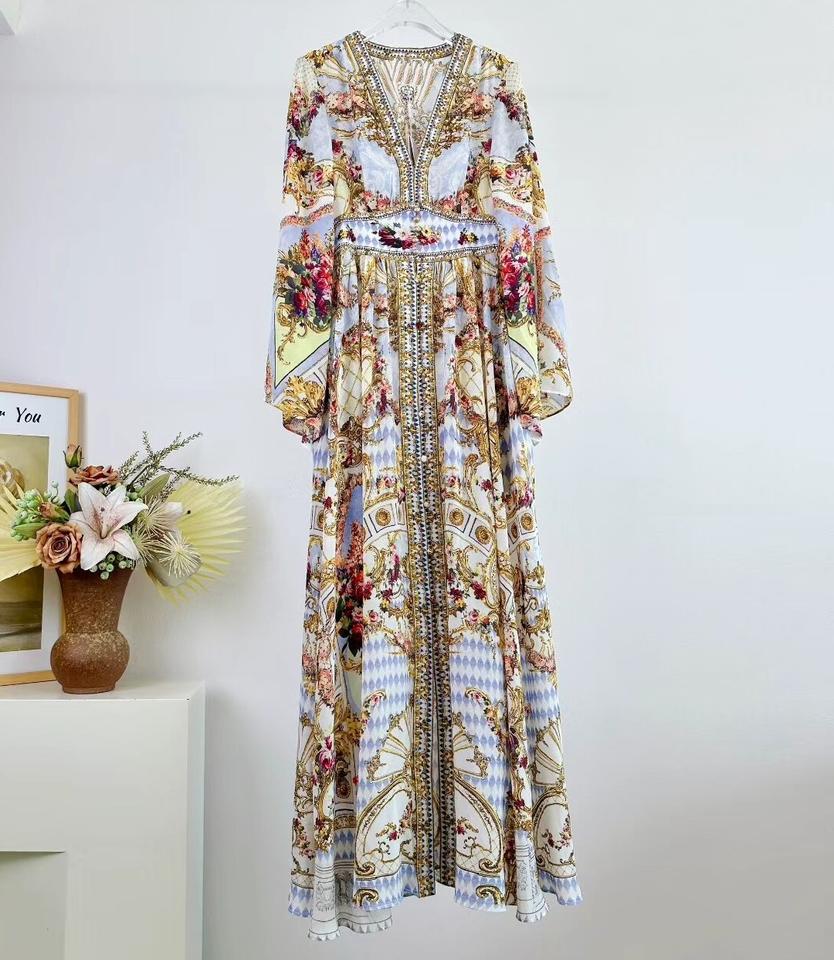100%Silk Long Evening Dress 2025 Autumn Style Women Sexy V-Neck Vintage Floral Prints Beading Deco Long Sleeve Maxi Dress Event