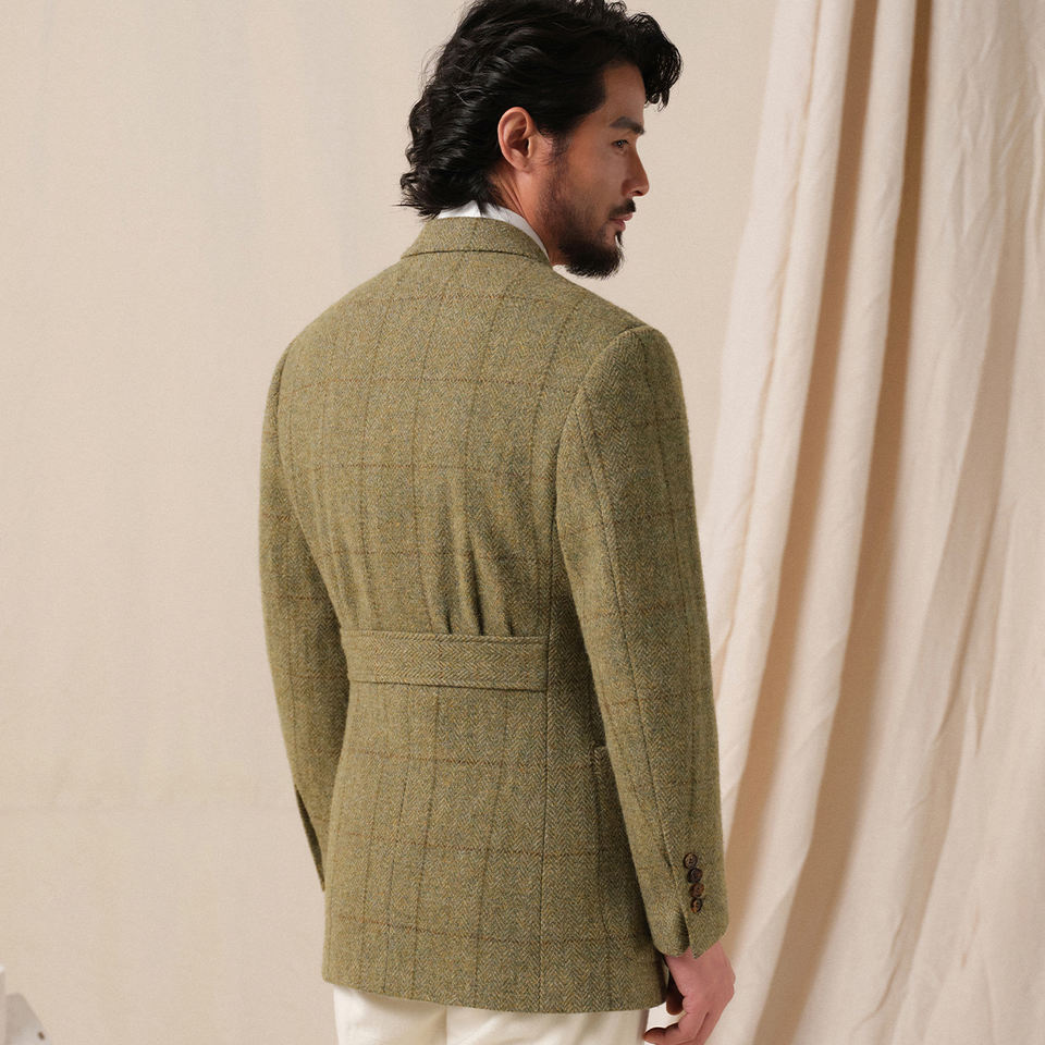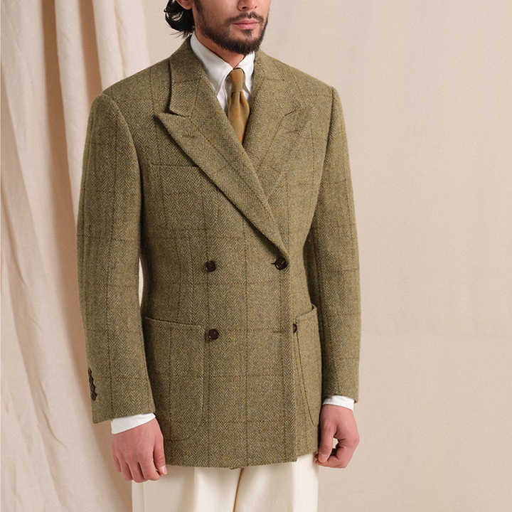 Blazer da Uomo 100% Lana di Alta Qualità, Giacca da Completo Vintage Verde a Quadri, Doppiopetto Spesso per Uomo