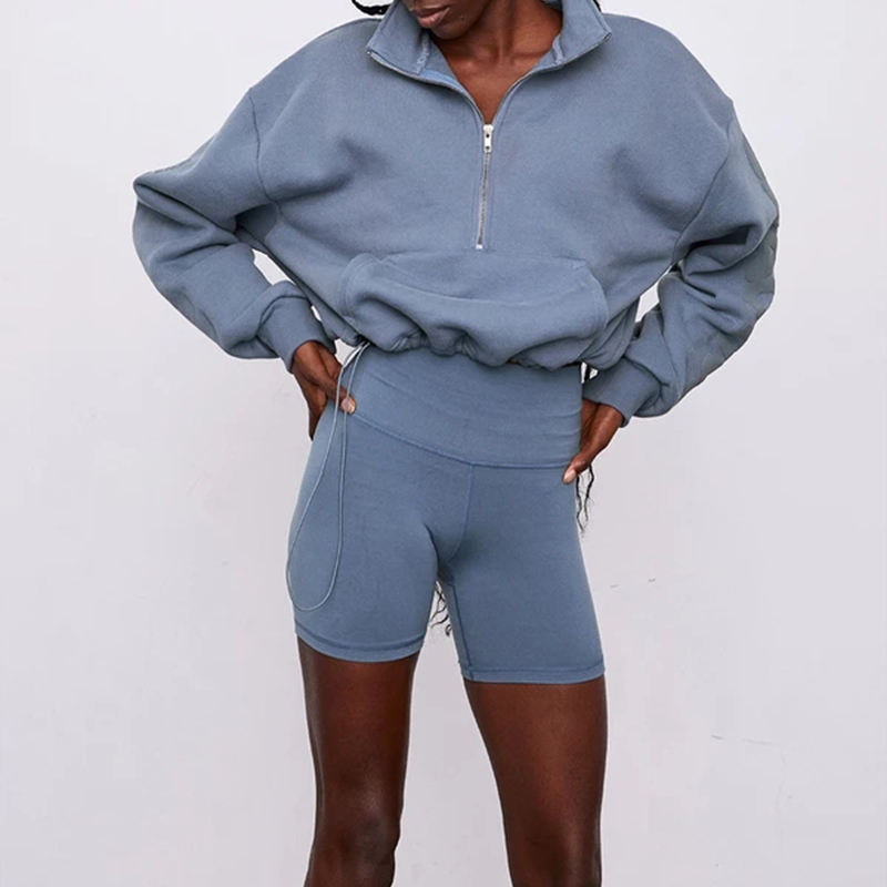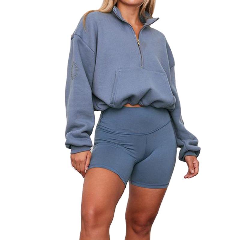 100%cotton Warm Fleece Womens Squad Quarter Zip Hoodie Plain Black Zipped Activewear Cropped Pullovers
