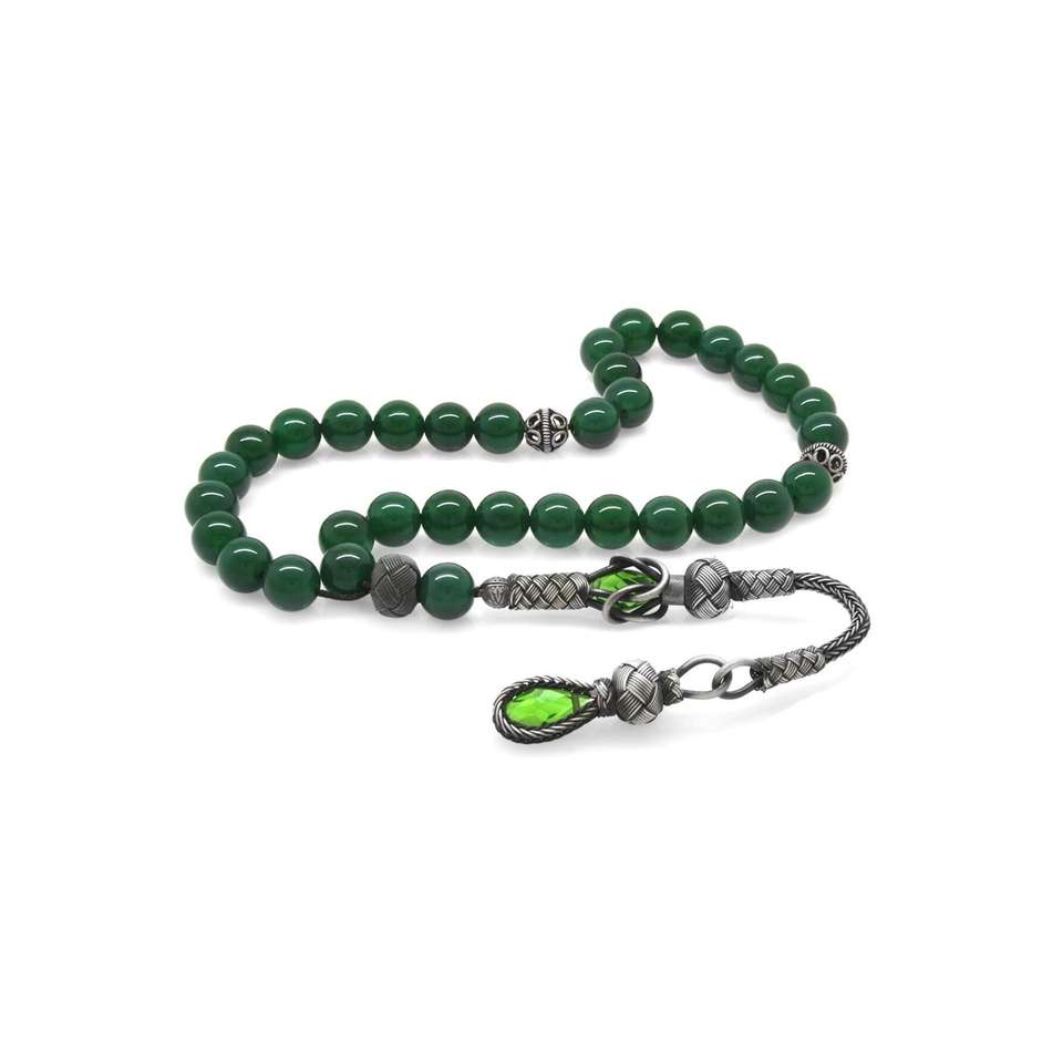 1000 Sterling Silver Kazaz Tasseled Sphere Cut Green Agate Natural Stone Prayer Beads