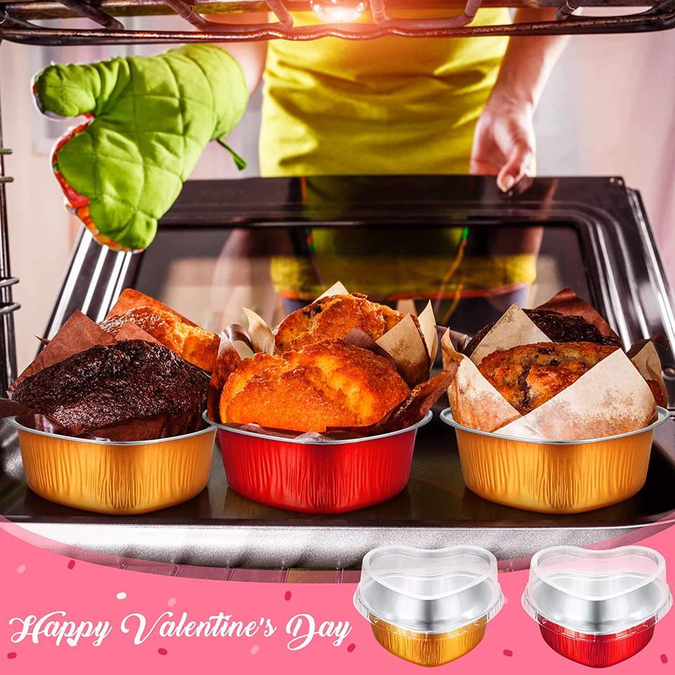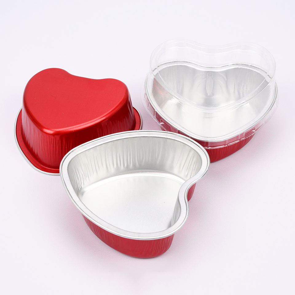 100 pezzo monouso tortiera a forma di cuore colorato foglio di alluminio stampo per la cottura Cupcake budino tazze con coperchio a cupola in plastica