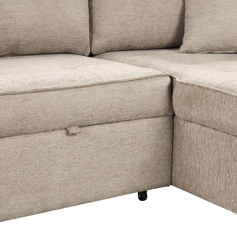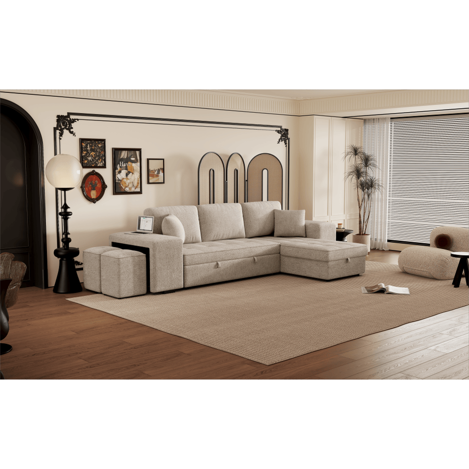 Divano Sezionale Moderno a L da 3 Posti Reversibile con Letto Estraibile e Chaise Longue Contenitore, 2 Sgabelli per Soggiorno - 104.5