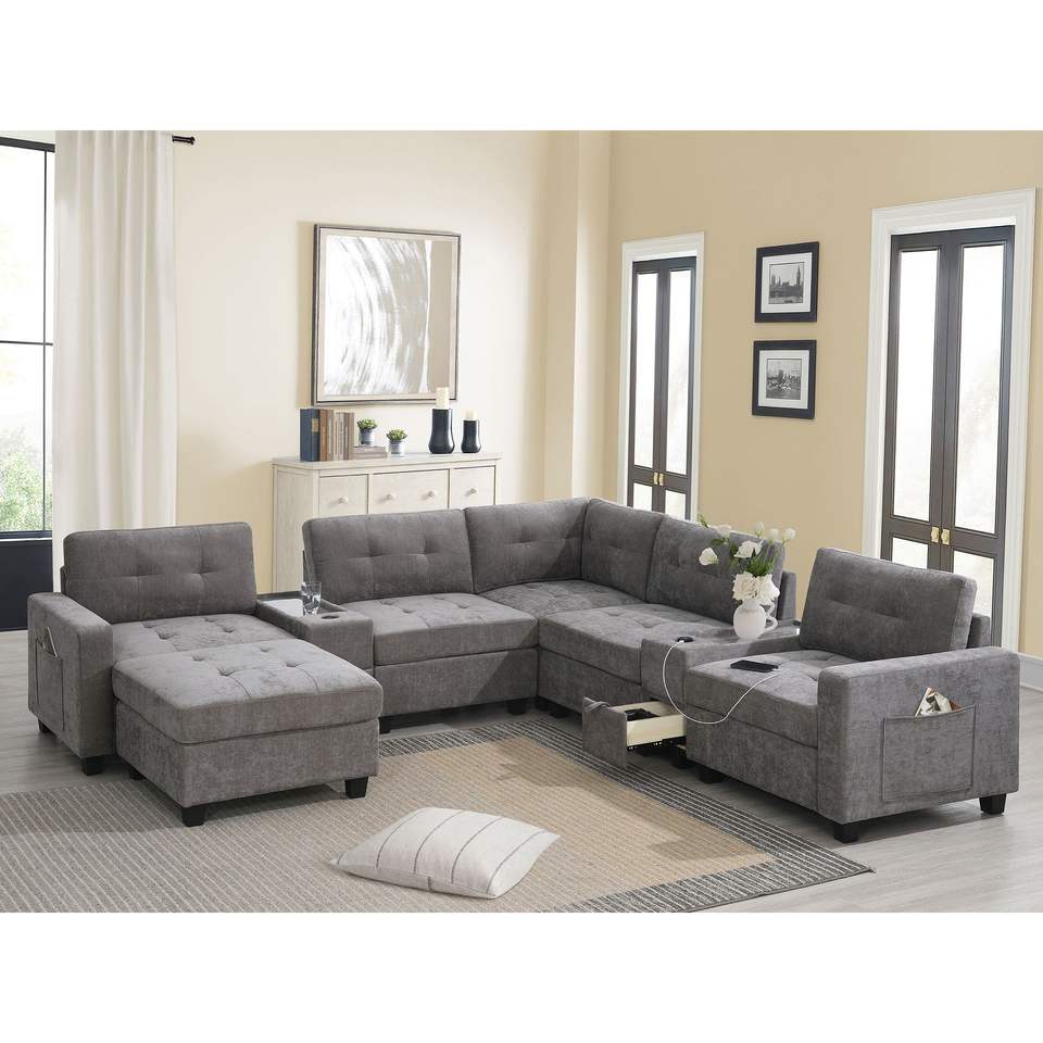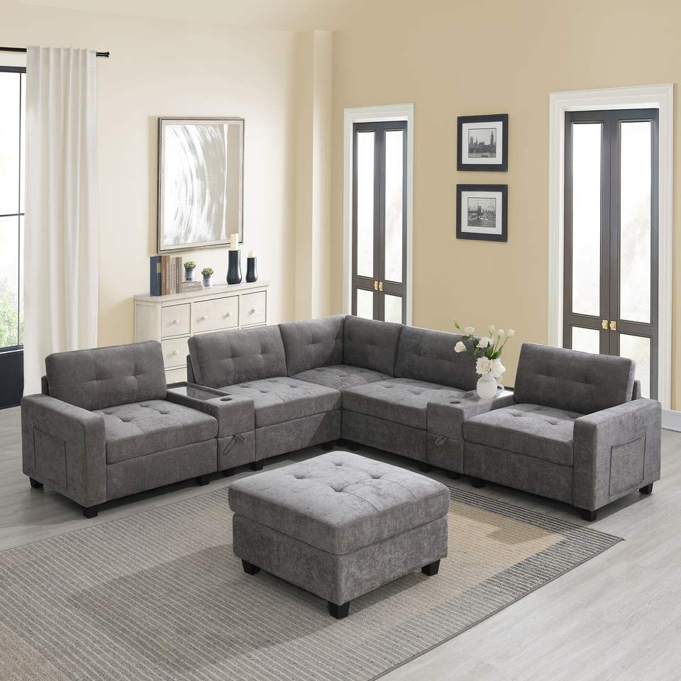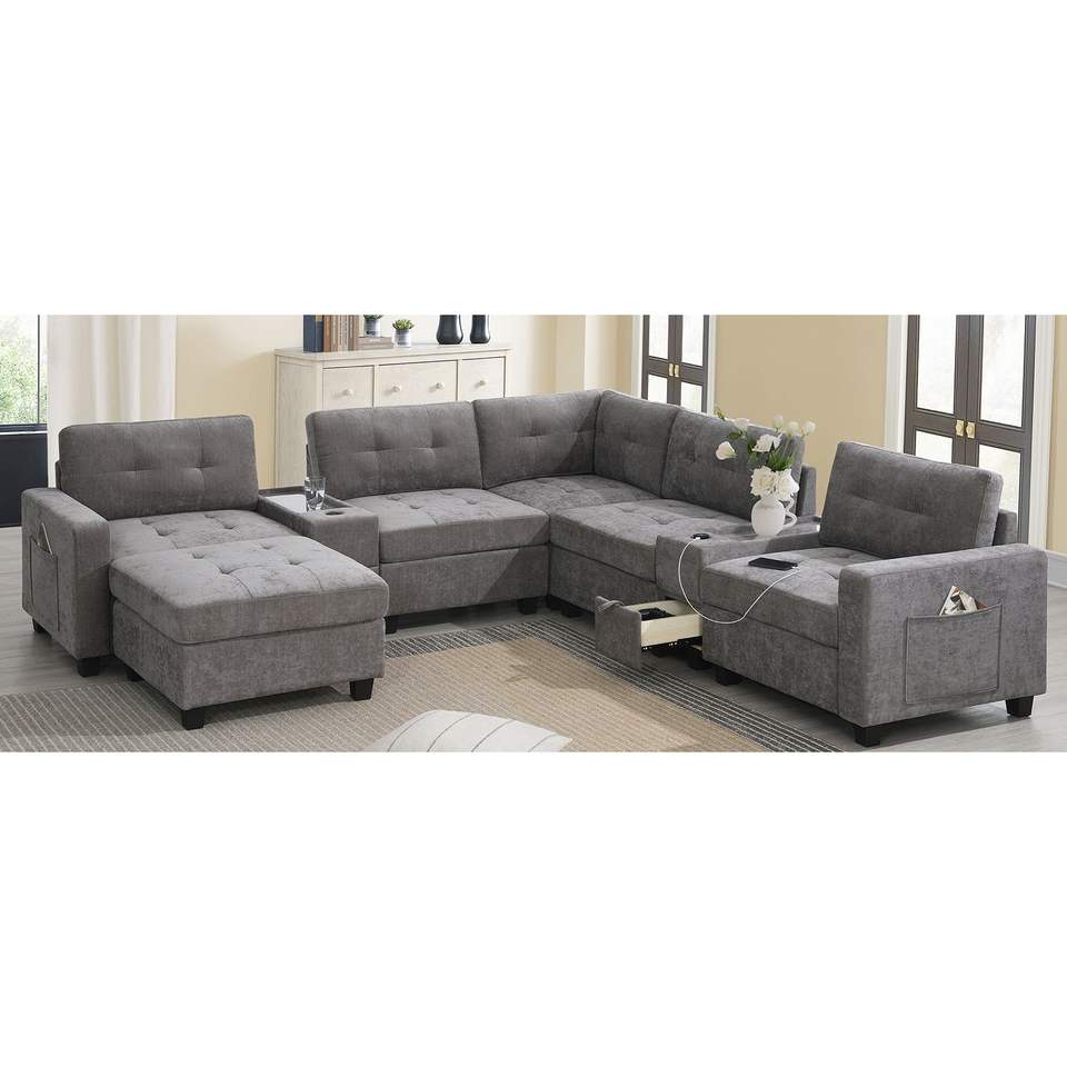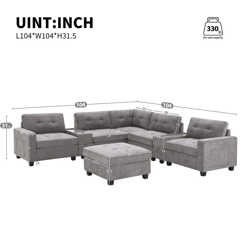 Divano Componibile 104 Pezzi con Piano in Acrilico, Set Divano a U in Ciniglia, 2 Console con Caricatore USB e Cassetti Portaoggetti per Soggiorno