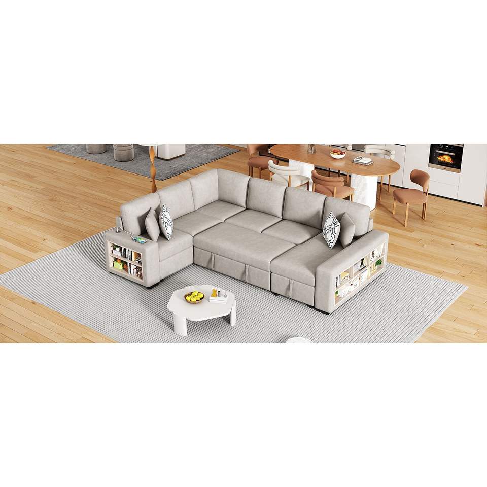 Divano Letto Sezionale a U da 109 Pollici con Due Porte USB e Chaise Longue Contenitore, Quattro Cuscini per il Soggiorno