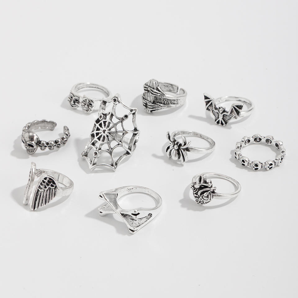 10 pz Set di anelli di pipistrello ragnatela gotico scuro Punk per uomo Hip-hop Color argento teschi con ala impilabile anello da dito gioielli di Halloween