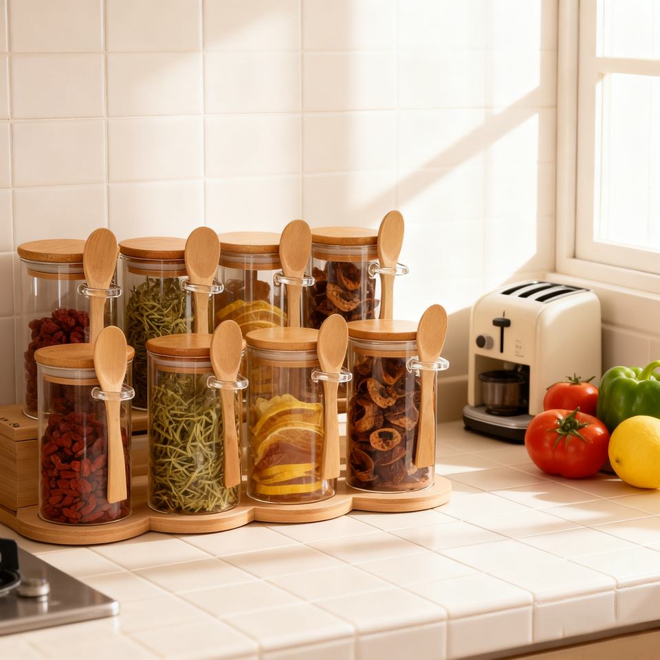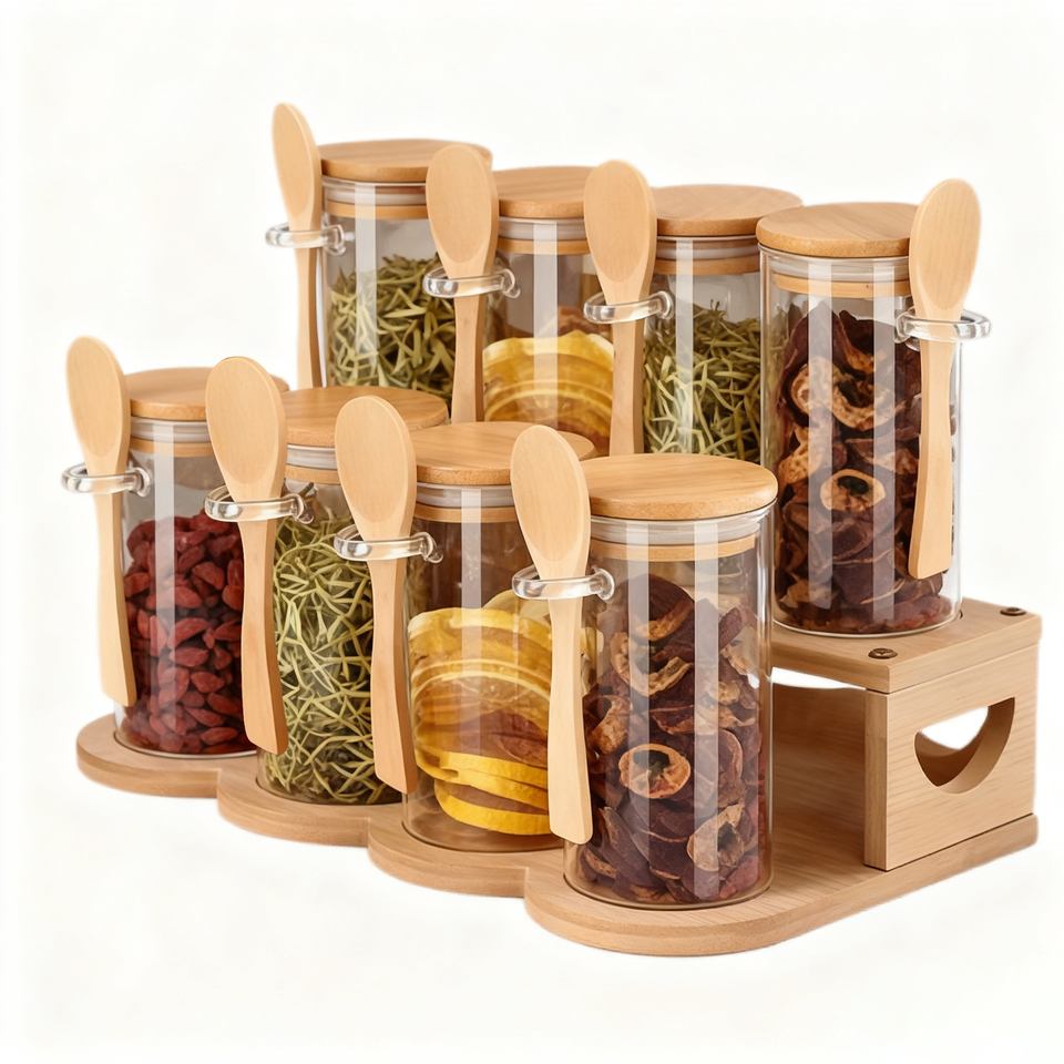 Nome del prodotto:Barattolo di stoccaggio in vetro borosilicato alto (Scaffale in legno non incluso)