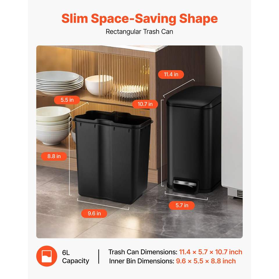 Cestino per Rifiuti in Acciaio Sottile 11,4 X 5,71 X 10,7 Pollici, Bidone per Camera da Letto con Pedale e Coperchio a Chiusura Morbida, Capacità 6L
