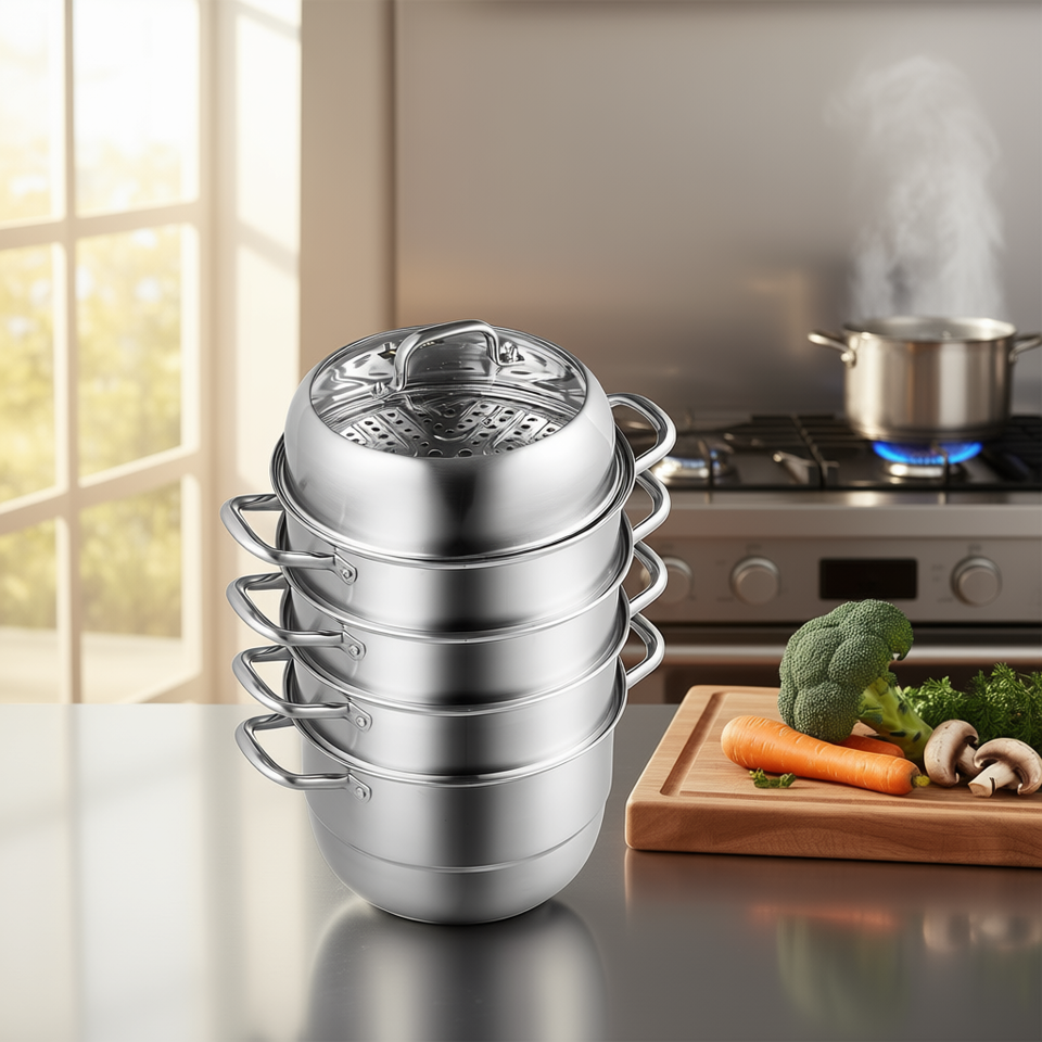 5 Tier Stainless Steel Steamer 28cm Dia Multi Layer Gas Grill Cookware With Glass Cover Silver Worktop