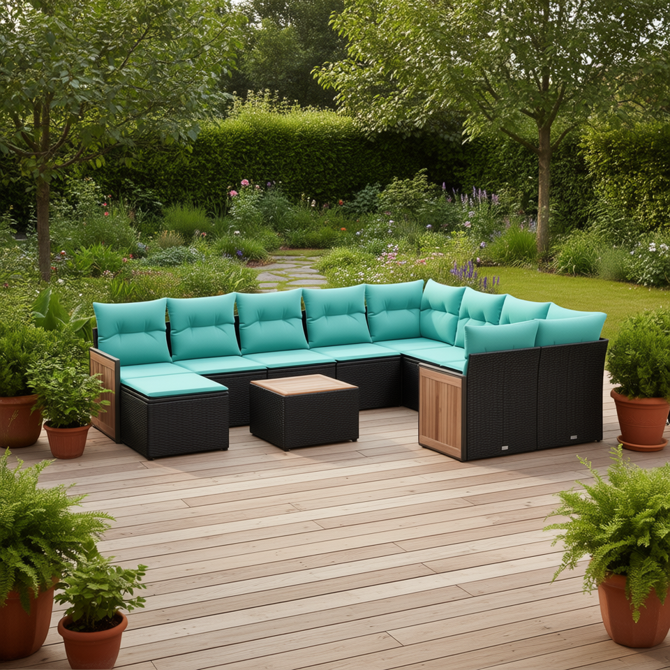 Set Divano da Esterno in Polyrattan Nero con Cuscini, 9 Posti, Design Contemporaneo, Stile Moderno