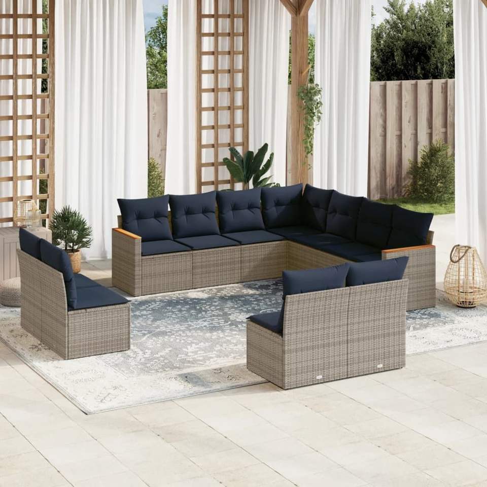 11-Piece Grey Poly Rattan Garden Sofa Set with Cushions for Patio Furniture