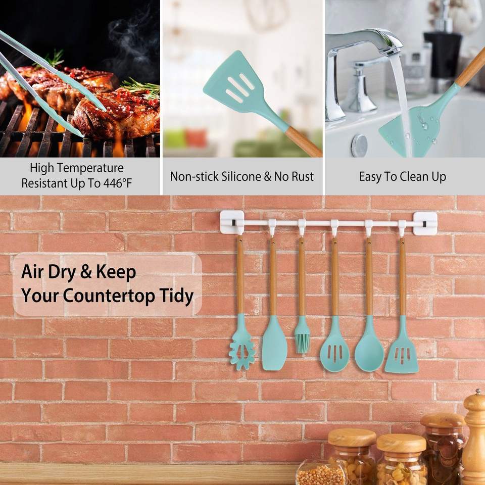 Set di 11 utensili da cucina in silicone con manico in legno, spatola resistente al calore, paletta, servispaghetti e pinze