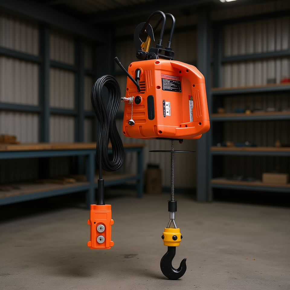 Argano Elettrico 1500W, Altezza di Sollevamento 25 Piedi, Capacità 1100 Libbre, Telecomando Cablato, Cavo in Acciaio Arancione, Gancio di Presa
