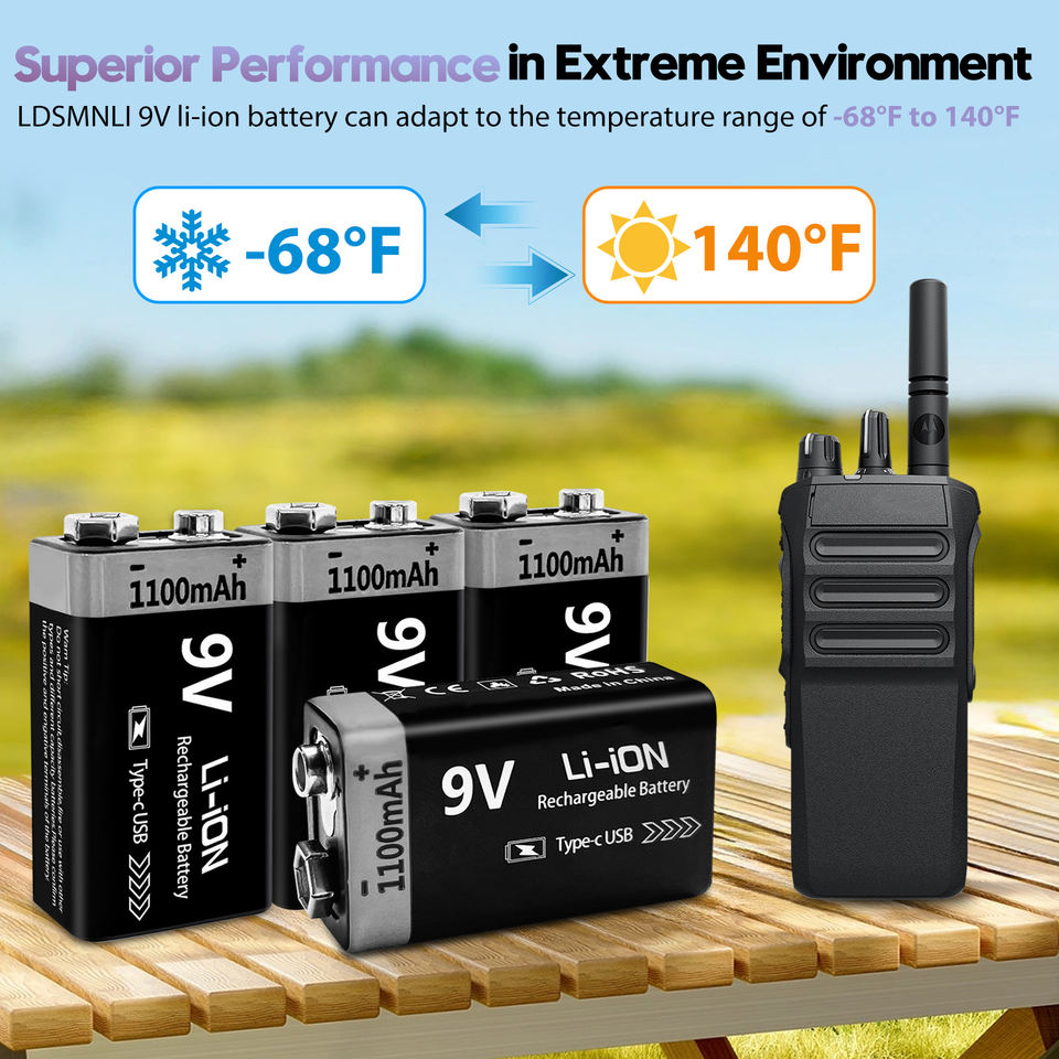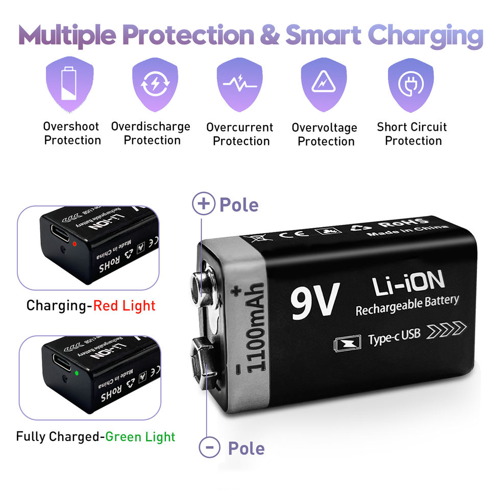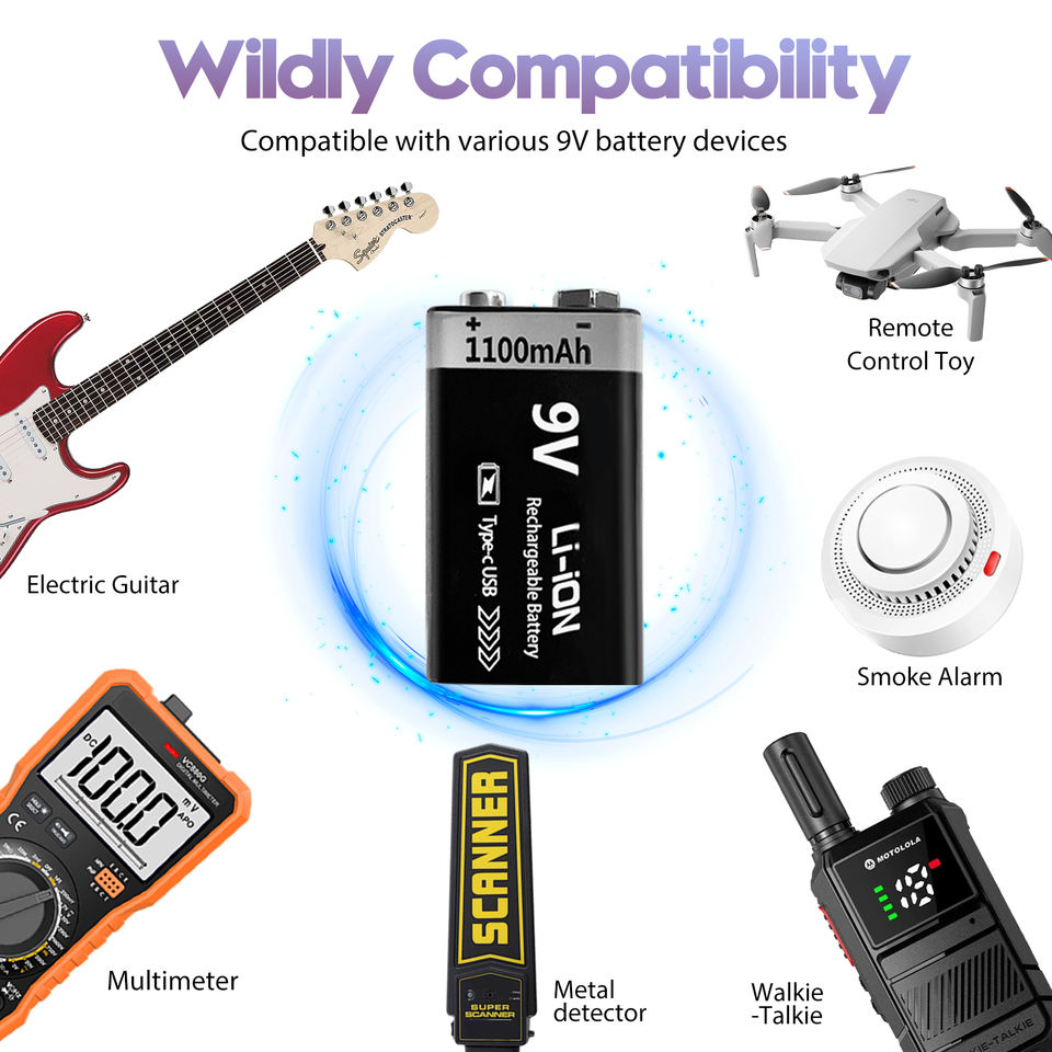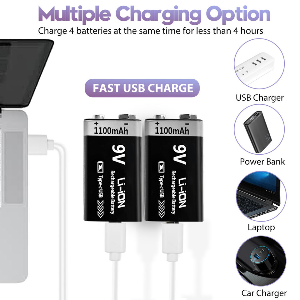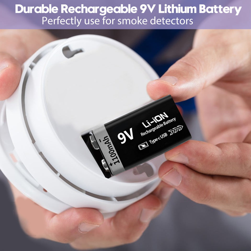 1100mAh lunga durata 4-in-1 USB C cavo di ricarica ricaricabile 9V batterie al litio per rilevatori di fumo Metal detector chitarra