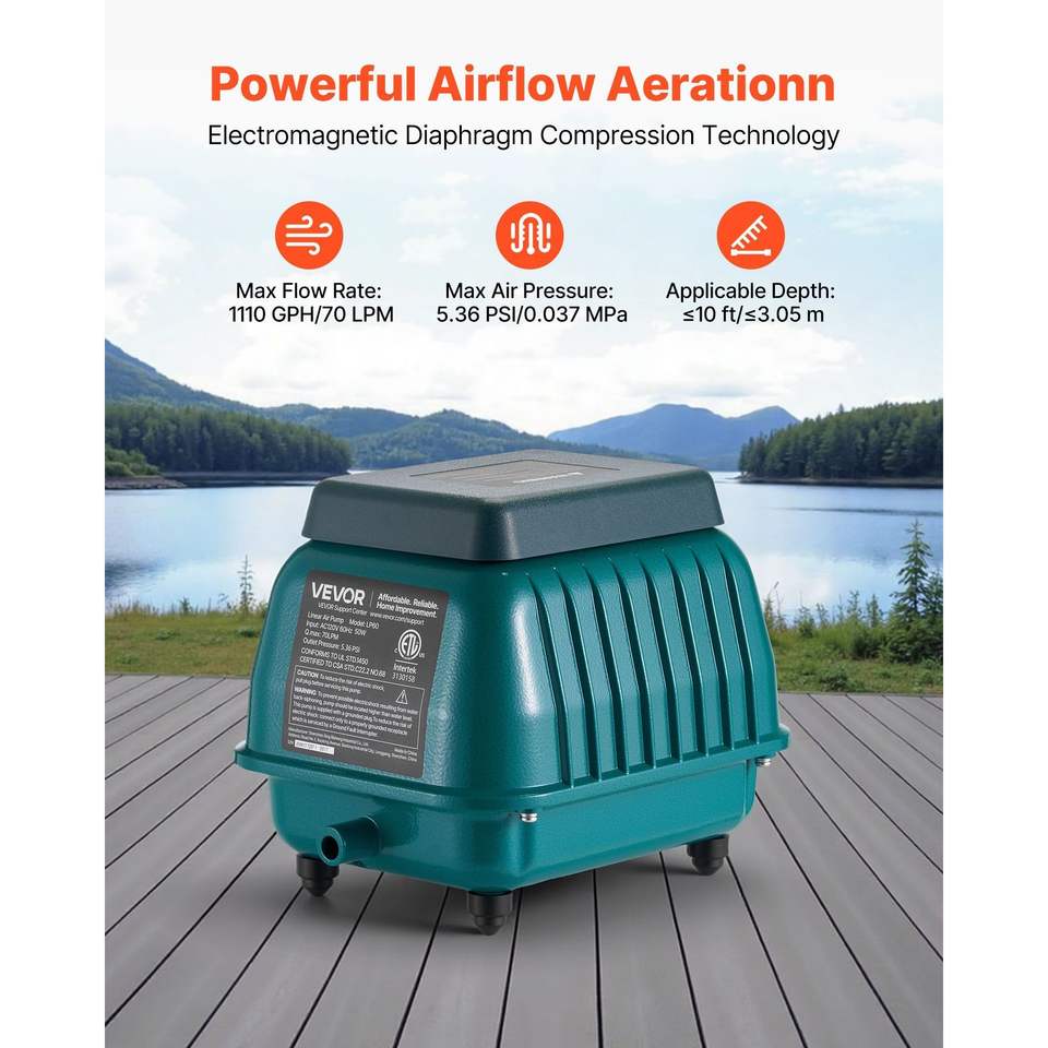 1110 GPH Linear Air Pump 10 ft Deep Ponds Septic Aeration System for Aquaculture Seafood Restaurants Fish Farms Waste Treatment