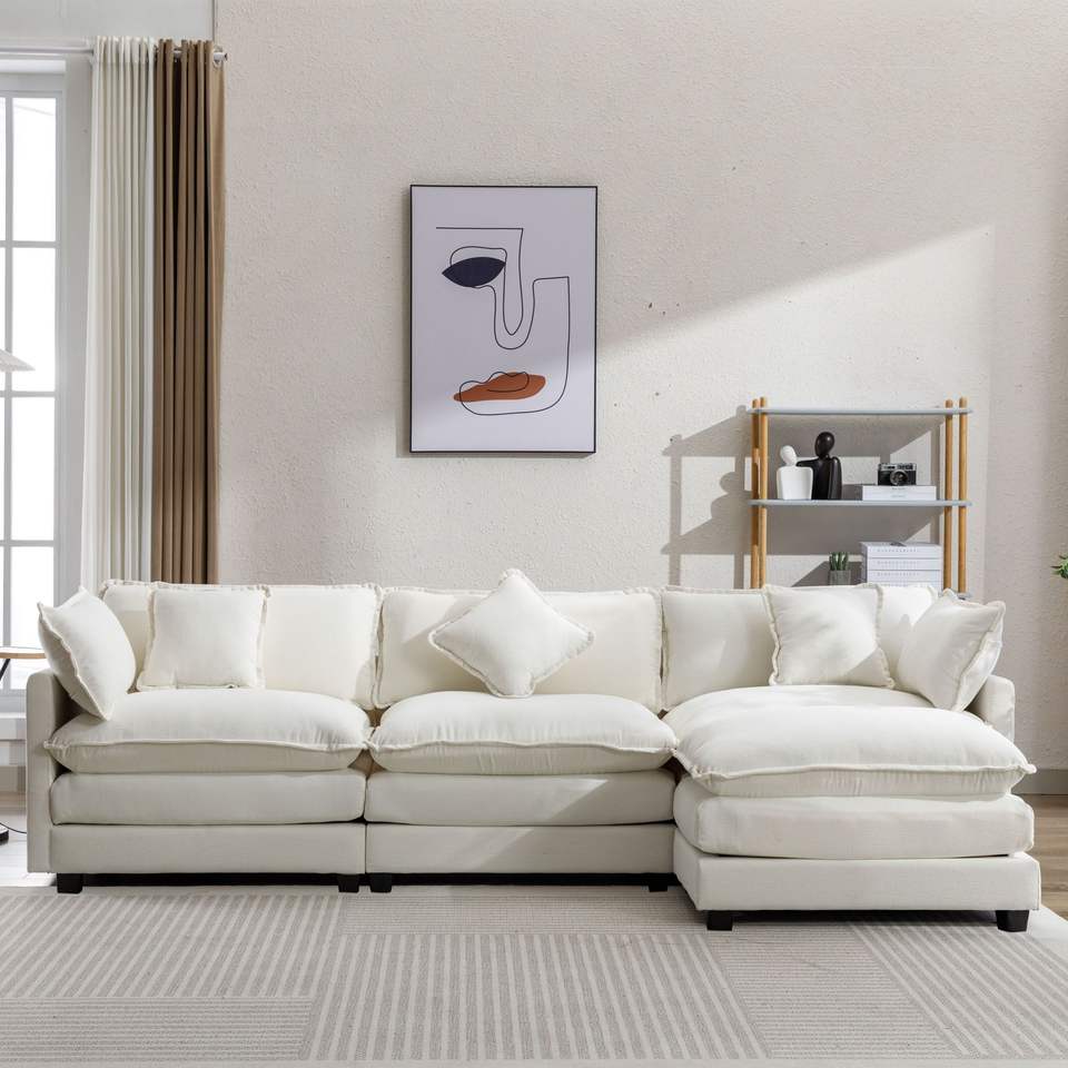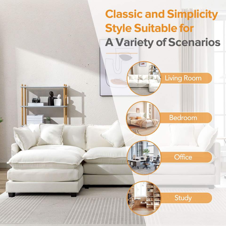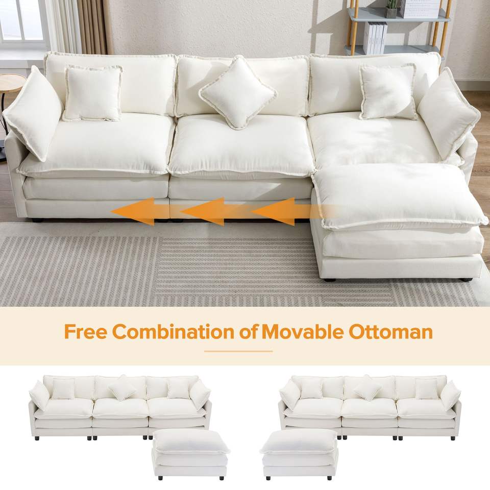 Divano Moderno di Lusso a Forma di L in Ciniglia da 285 cm con 5 Cuscini e Pouf per Soggiorno