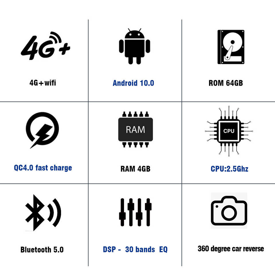 GPS, Stereo Stereo, HANDSFREE, TPMS, RGB, Telecomando, Amplificatore, OBD2, DSP, CarPlay, DVB +, Specchio Link, Android auto, Microfono incorporato, Schermo diviso, File Manager, Hi-Res Audio, Auto Controllo del Volante, Altoparlante integrato