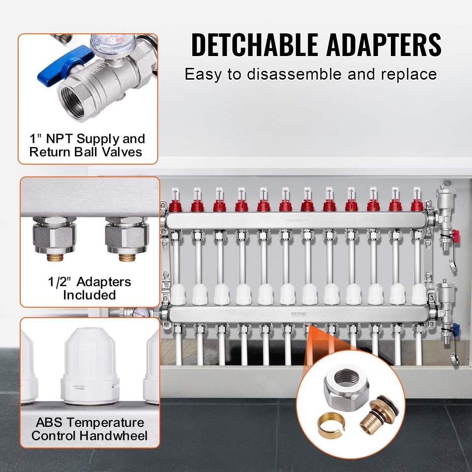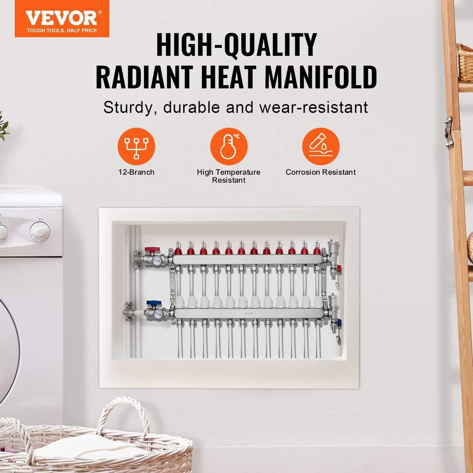 Collettore a 12 ramificazioni da 1/2 pollice in acciaio inossidabile per tubi PEX, per sistema di riscaldamento a pavimento radiante idronico, componenti HVAC
