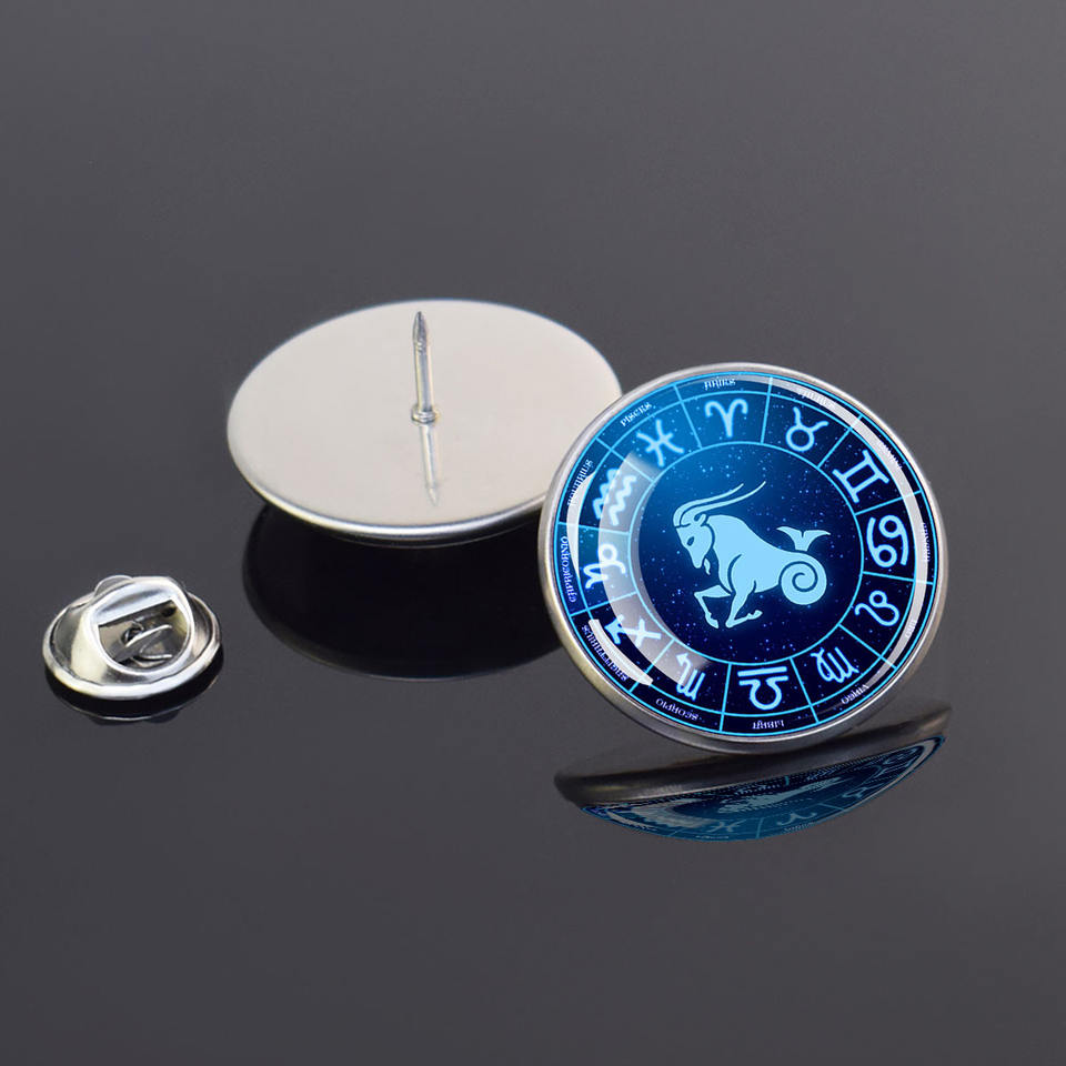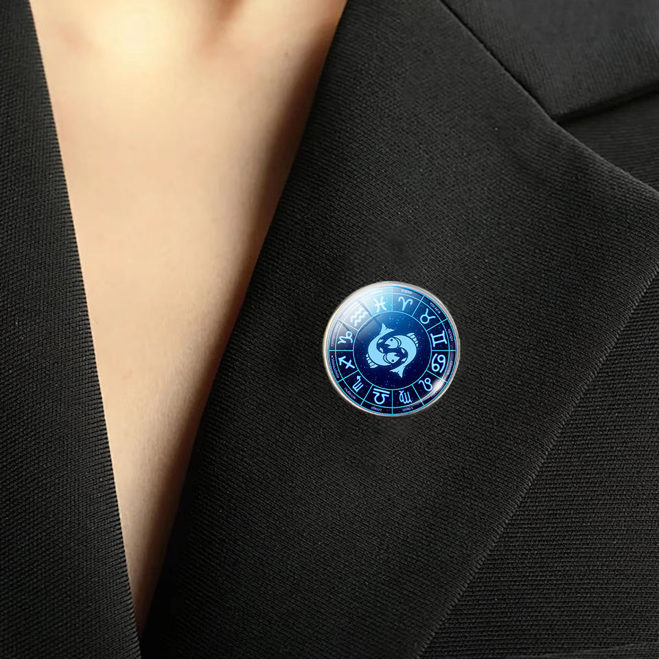 Spilla con design a mappa stellare delle 12 costellazioni, spilla da collo in vetro con segni zodiacali blu, accessorio rotondo in acciaio inossidabile per borse e abbigliamento