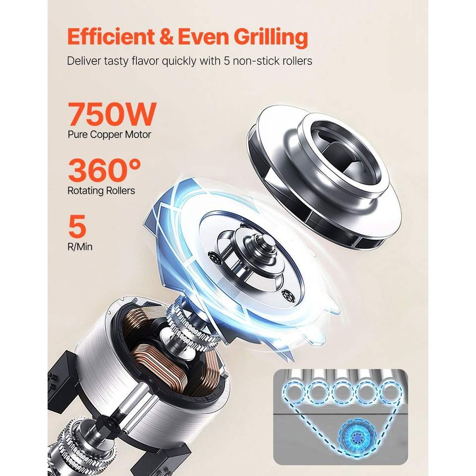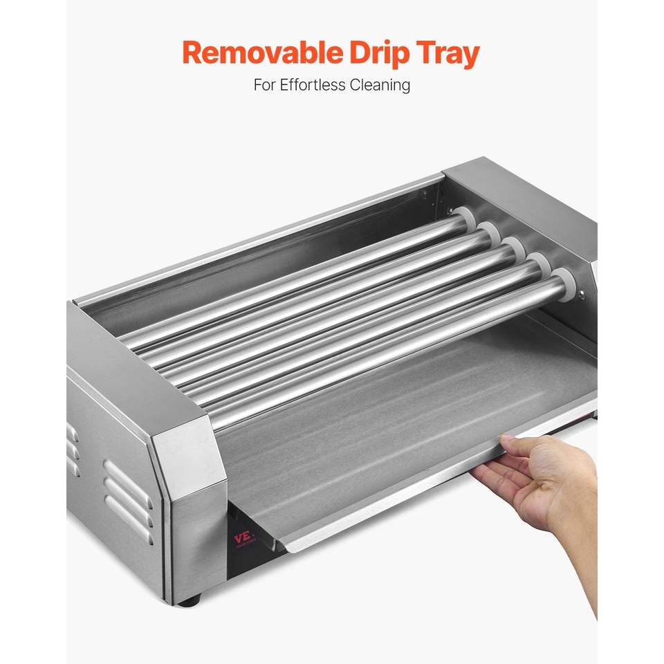 Griglia per Hot Dog a 5 Rulli in Acciaio Inox, 750W, Doppio Controllo della Temperatura, Macchina per Hot Dog Rimovibile, Accessori per BBQ