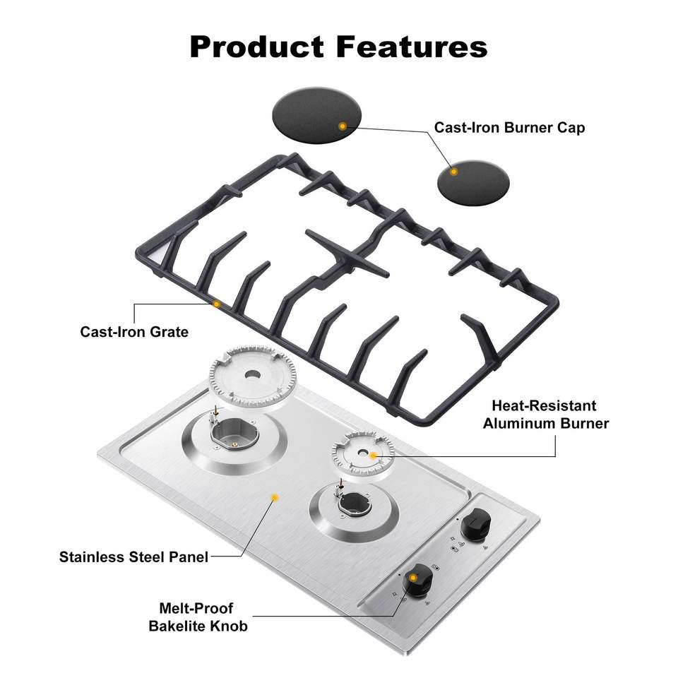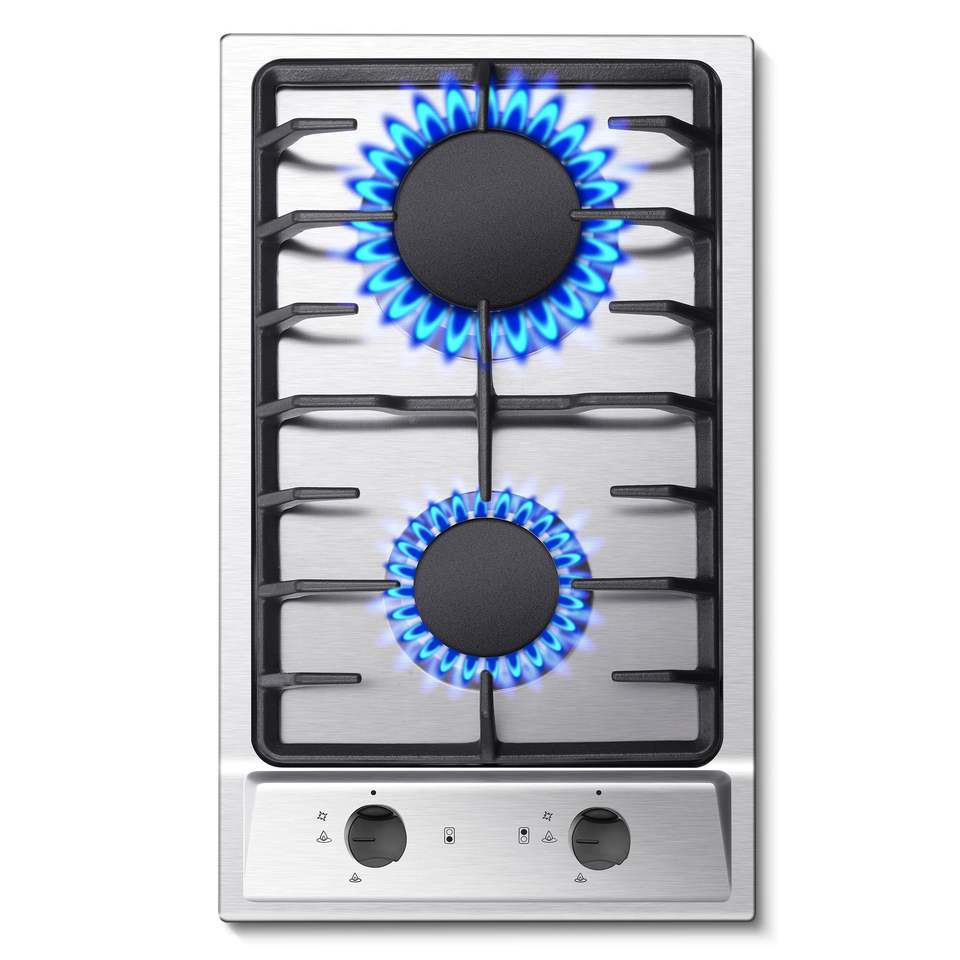 Piano Cottura a Gas Incasso da 12 Pollici in Acciaio Inox/Vetro Temperato, Fornello a 2 Fuochi a Propano