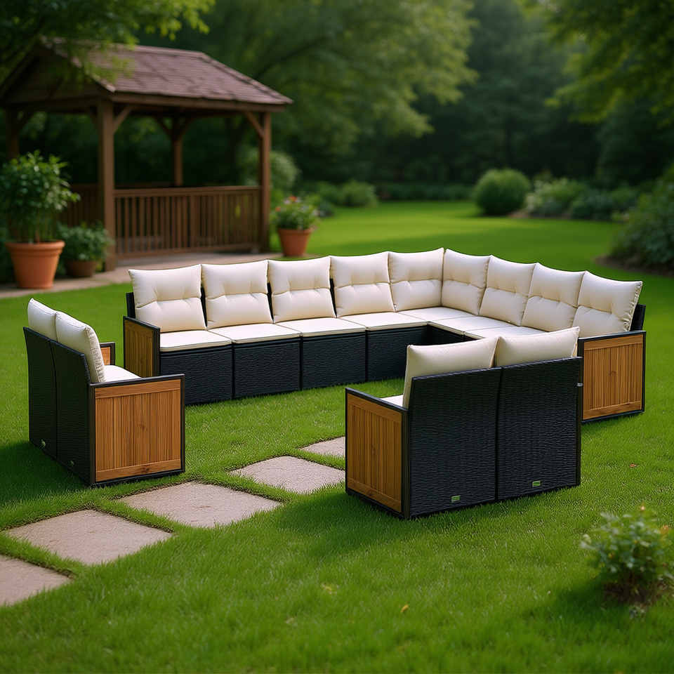 Garden Sofa Set In Black Pe Rattan With Teak Panels 10 Plus Seating Capacity Contemporary Design Outdoor Use