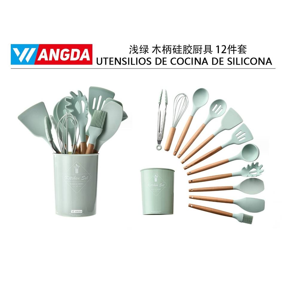 Set di utensili da cucina in Silicone con manico in legno verde chiaro da 12 pezzi in gomma con manico in Nylon per uso domestico in cucina